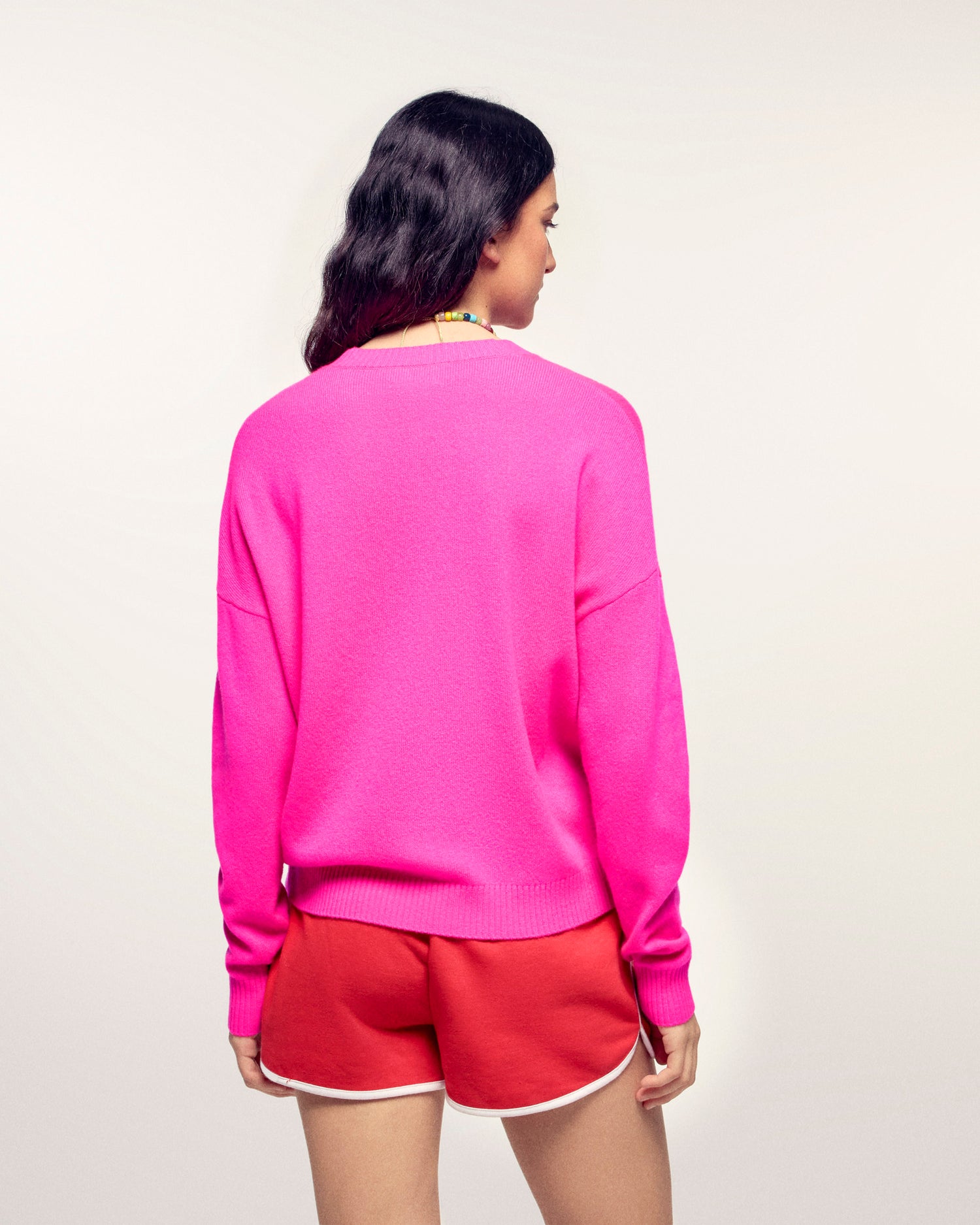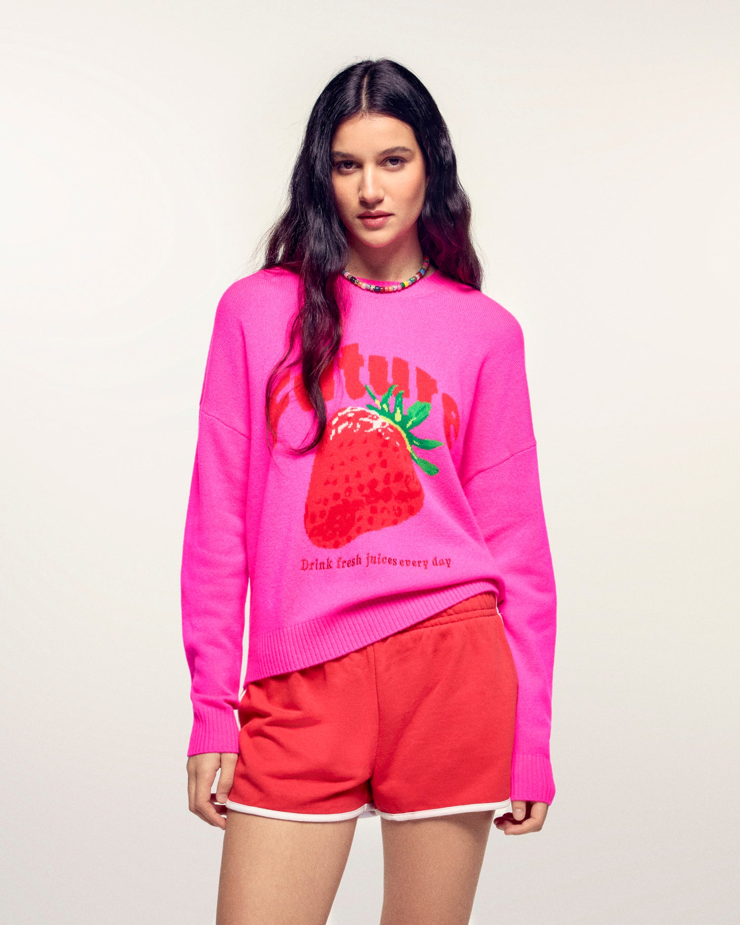The gourmet sweater. Crafted from 2-ply Cashmere, this crewneck sweater offers a soft and light knit. Its timeless regular fit is boosted by a large strawberry Intarsia motif, accompanied by the inscriptions "Future" and "Drink fresh juices every day".