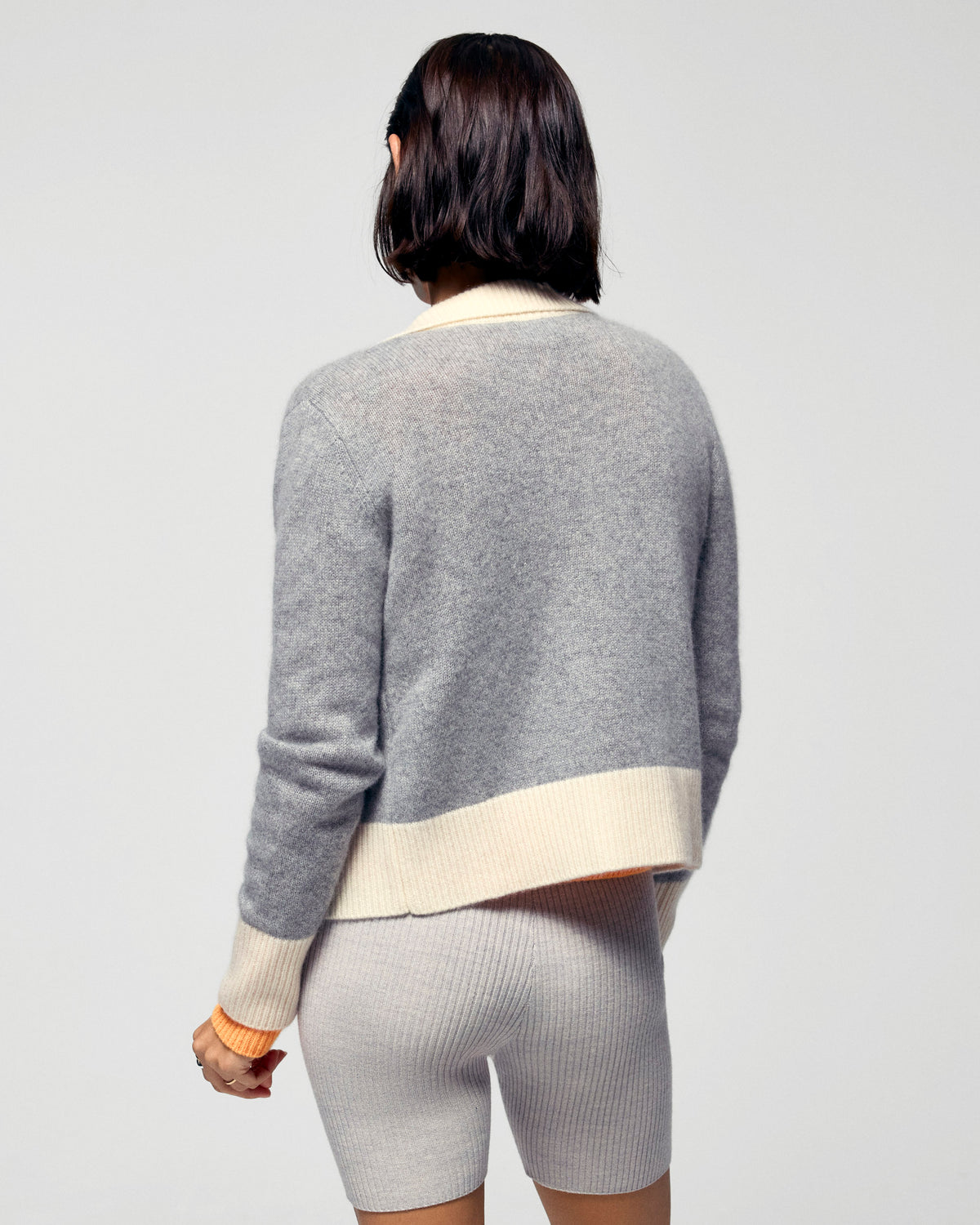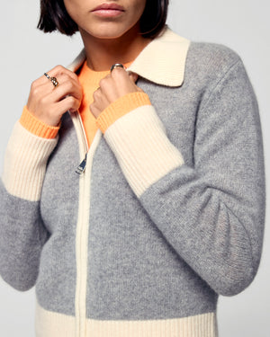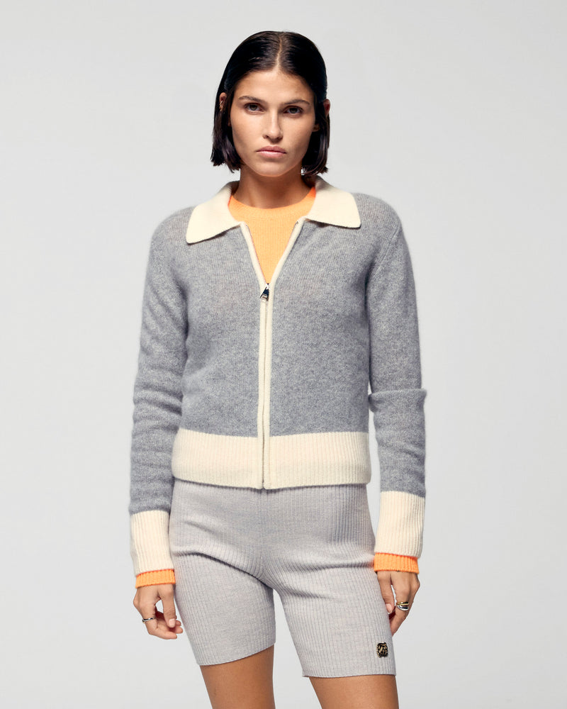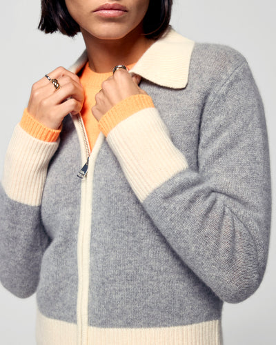 Make a statement with our short cardigan sweater crafted from cashmere. Bold contrasting trims accentuate the shirt neck, zip closure, and cuffs. Pair with your favorite jeans or tailored pants for a chic and casual look.