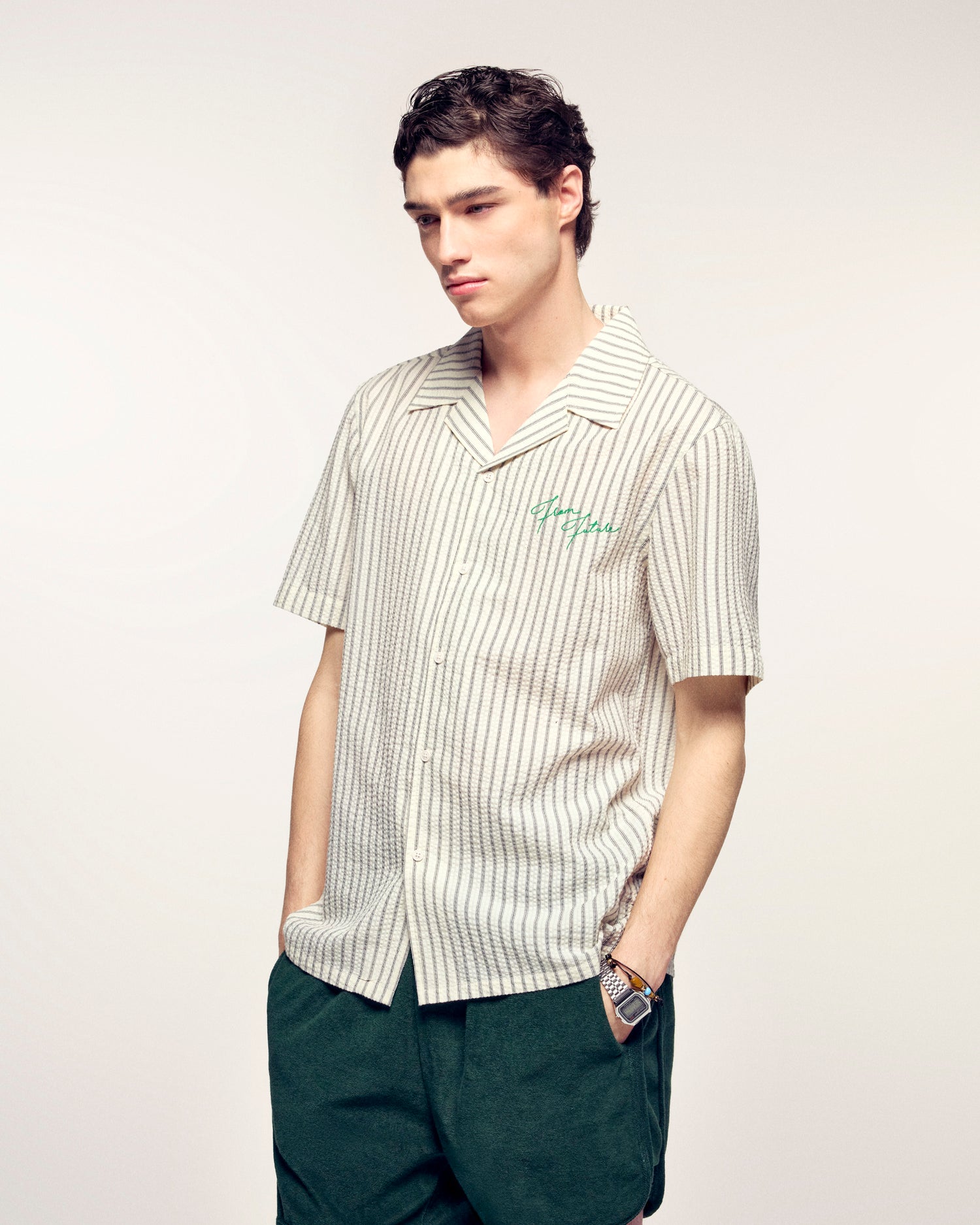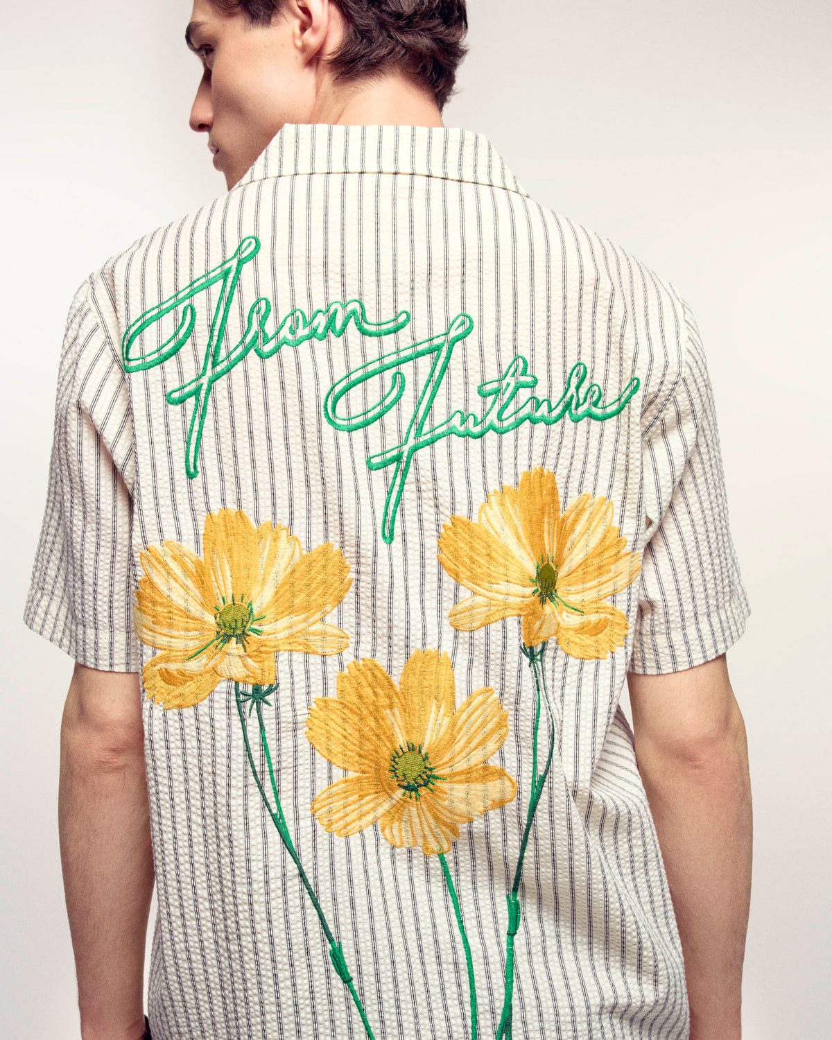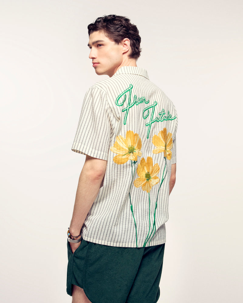 The perfect summer twist. This short-sleeved shirt plays the style card with its fine stripes and floral patterns embroidered on the back. A casual essential, signed From Future.
