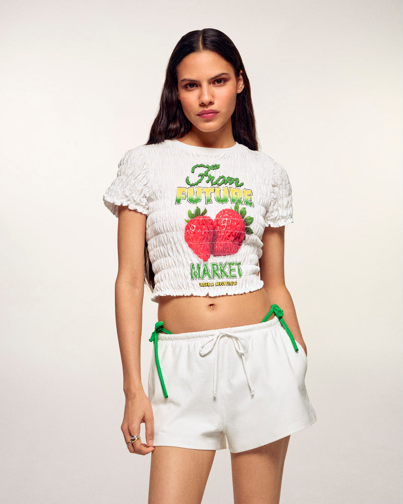 This short t-shirt revisits streetwear codes with an original texture. Entirely crafted with smocking, it offers a slim and stretchy fit that perfectly hugs your curves. It stands out with its "FROM FUTURE MARKET" graphic accompanied by a strawberry visual on the front, bringing a playful and colorful touch to your outfit.