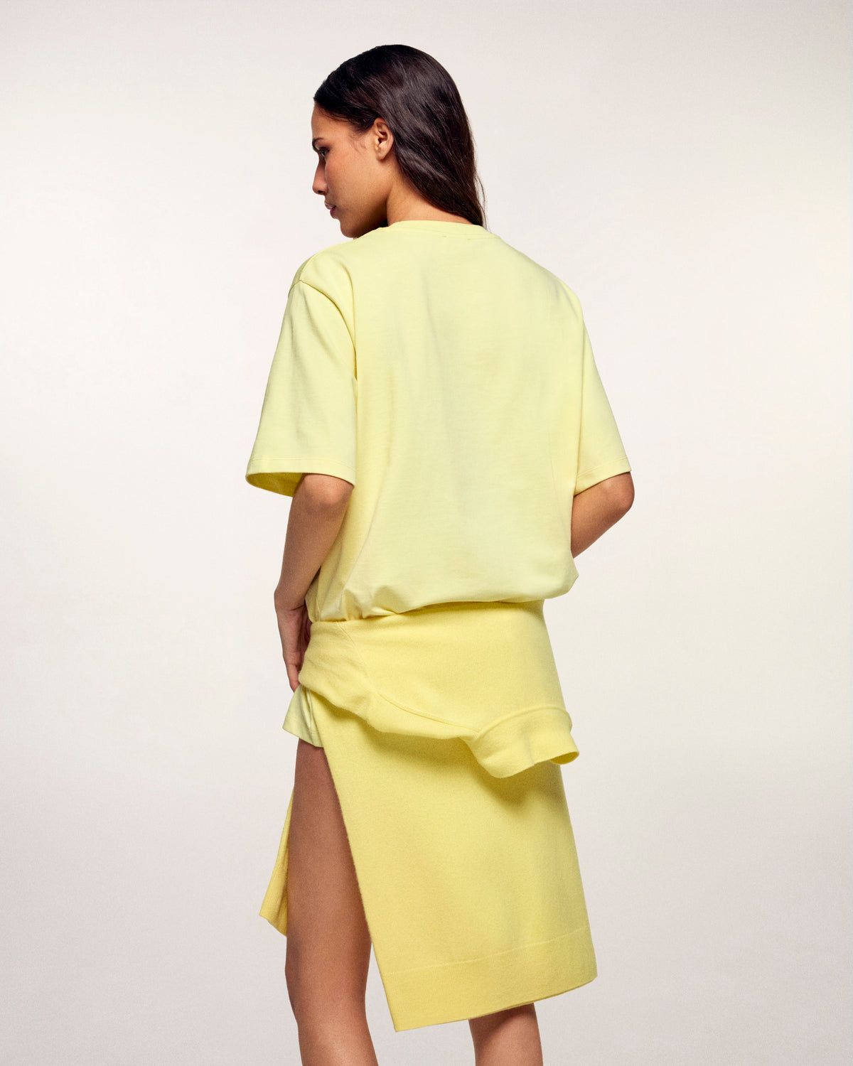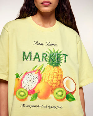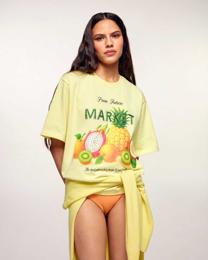 A casual piece with a sunny and graphic character that brings a vibrant energy to your wardrobe. This cotton jersey T-shirt stands out with its exclusive “From Future Market” print, featuring a composition of fresh fruits for a playful and summery look.