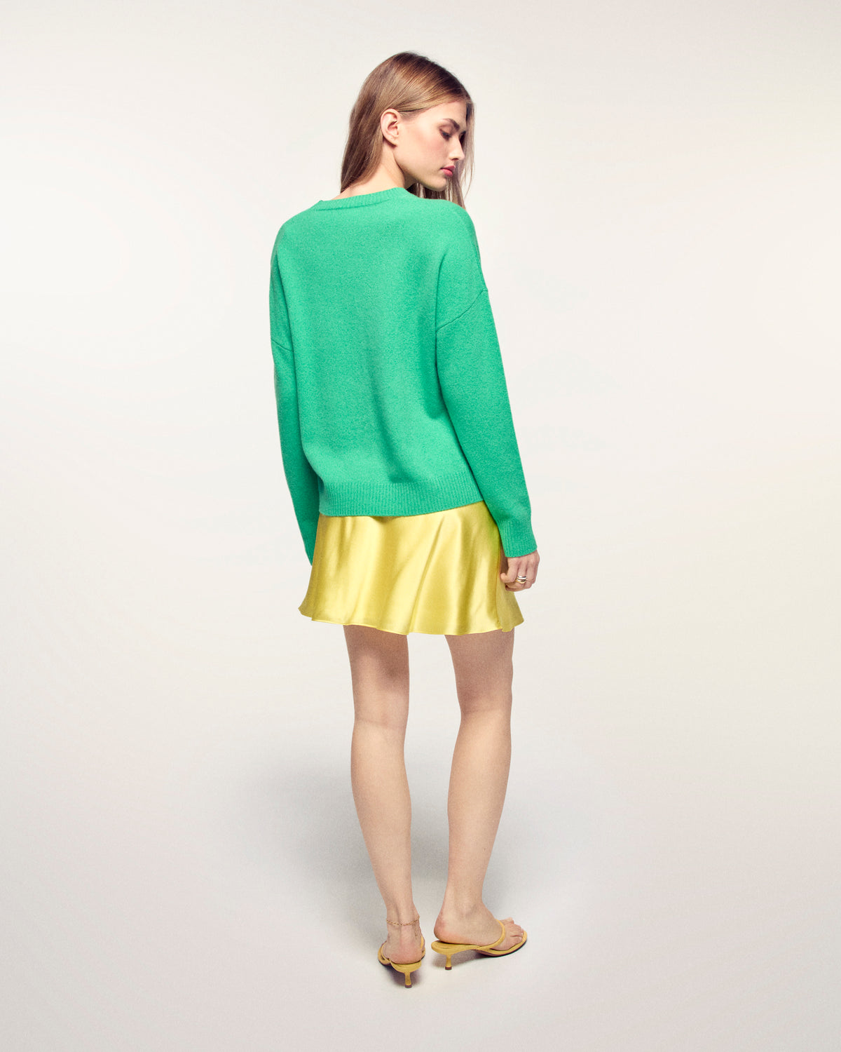 The gourmet sweater. Crafted from 2-ply Cashmere, this crewneck sweater offers a soft and light knit. Its oversize fit is boosted by a large lemon Intarsia motif, accompanied by the inscriptions "Future" and "Eat fresh fruits every day".