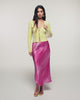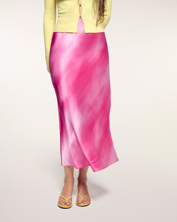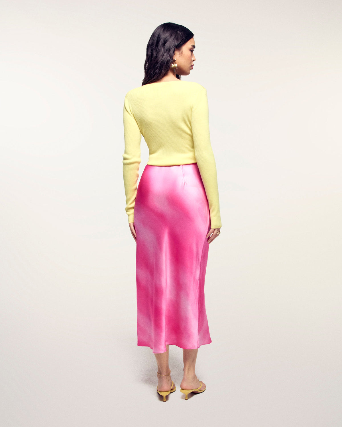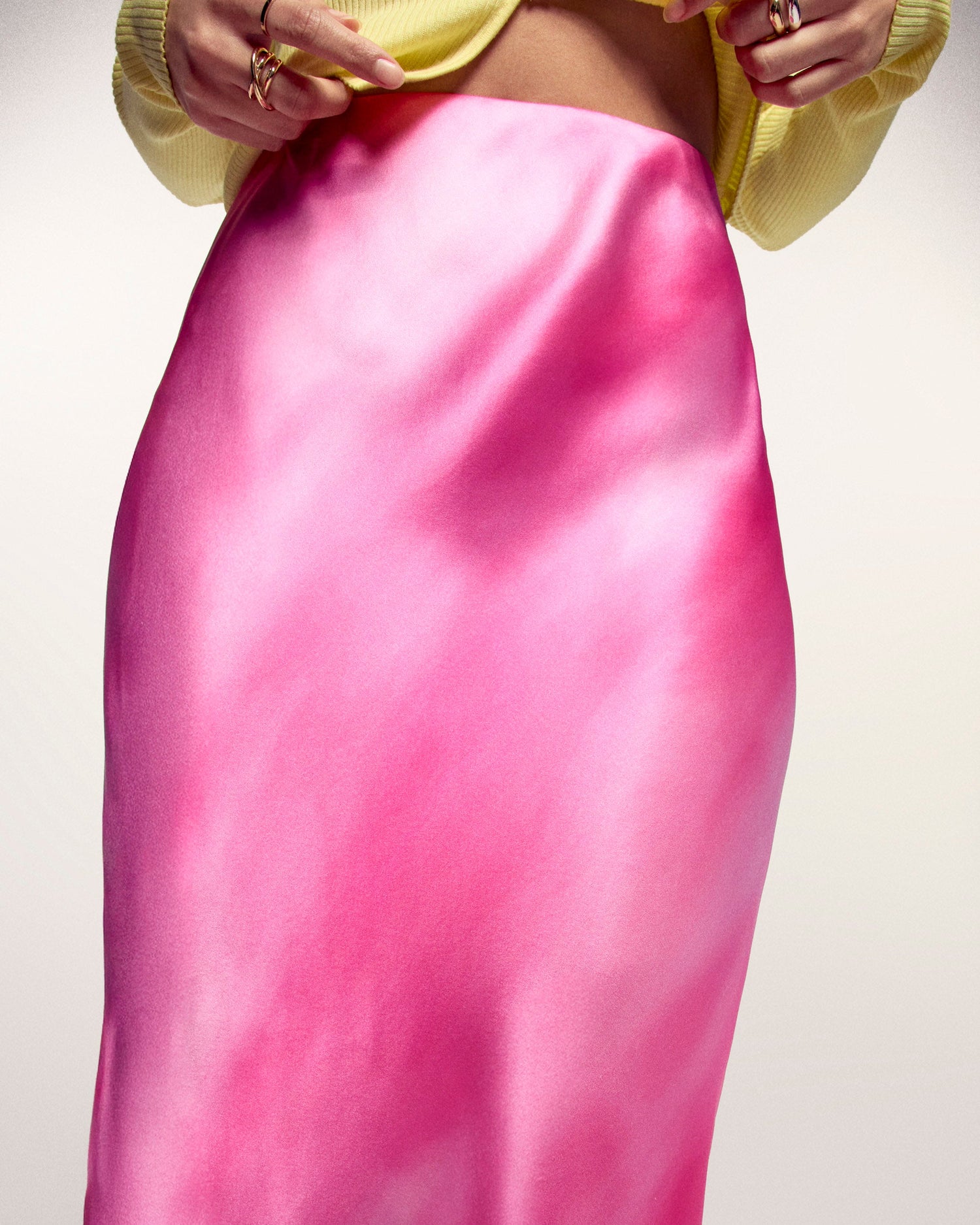 Crafted from light and shiny silk satin, the Vicky mid-length skirt bestows great allure. With full elegance, it reveals a fluid and flared drape. Ideal for all circumstances, it pairs perfectly with a structured top or a satiny shirt.