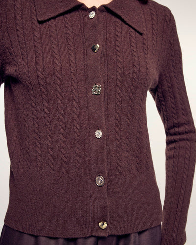 Fine Cable Knit Cardigan Novelty Buttons - 100% Cashmere - GCS Verified - Chocolate