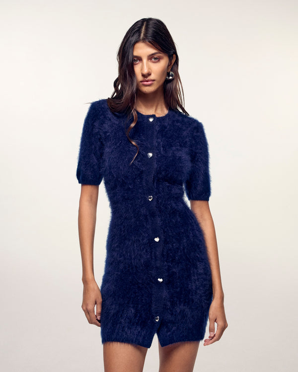 A charming knit dress with a retro feel, featuring structured volume, delicate textures, and a row of silver heart-shaped buttons for a feminine finish. - Dress in GCS-certified 2-ply cashmere - Silver heart-shaped buttons - Brushed ribbed knit - Regular fit - 2-ply cashmere - The Good Cashmere Standard® (GCS) is an independent standard for sustainable cashmere, that aims to improve the welfare of cashmere goats, the working conditions of farmers and to protect the environment.