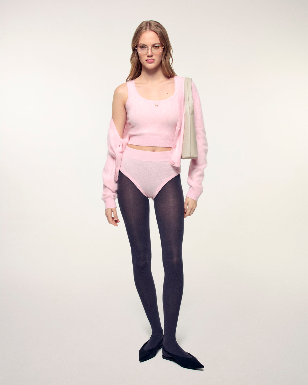 A cashmere bralette that blends softness, modern style, and attitude, designed to be worn solo or layered while delivering irresistible everyday comfort. - Bralette in GCS-certified 2-ply cashmere - Golden metallic logo plaque - Brushed knit - Slim fit - 2-ply cashmere - The Good Cashmere Standard® (GCS) is an independent standard for sustainable cashmere, that aims to improve the welfare of cashmere goats, the working conditions of farmers and to protect the environment.