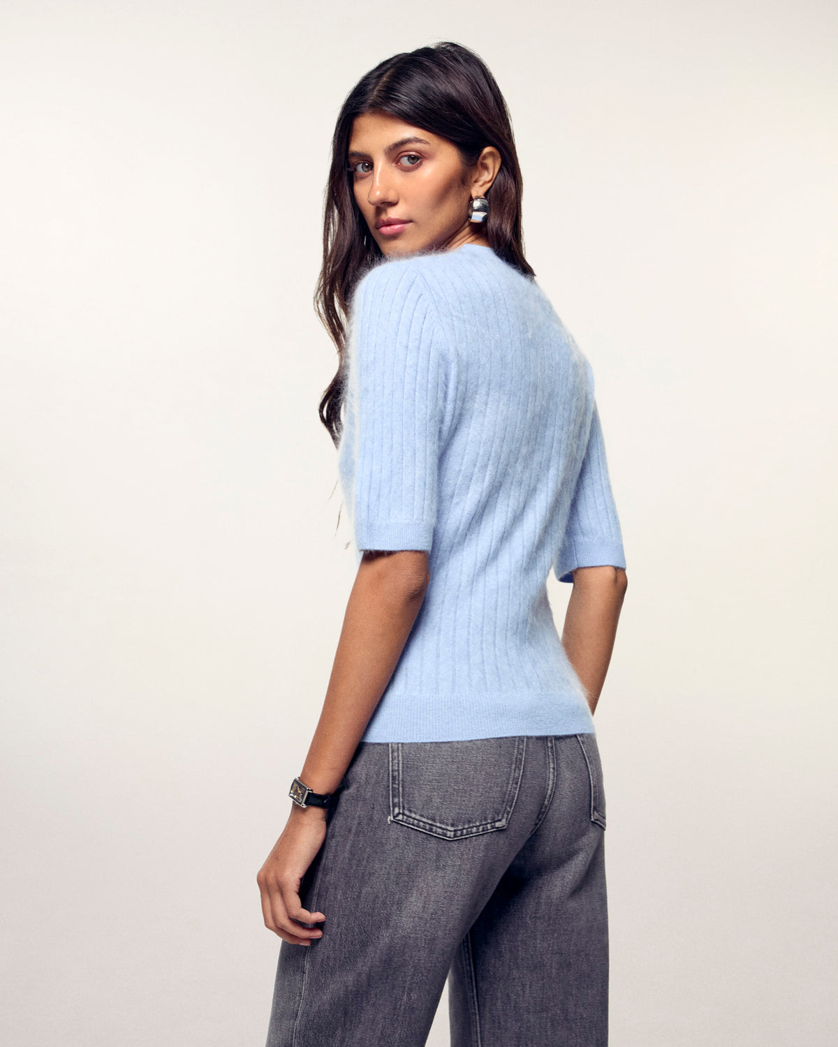 100% GCS-certified cashmere (Good Cashmere Standard). This standard guarantees a more sustainable cashmere, promoting animal welfare, improving farmers’ working conditions, and protecting the environment. Hand wash in cold water recommended. Maximum 20°C. Do not rub or wring. Dry flat, no machine spin. Iron at low temperature. Dry cleanable.
