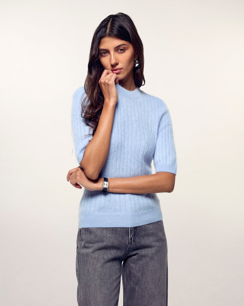 Brushed Striped Short-Sleeve Top - 100% Cashmere - GCS Verified - Baby Blue