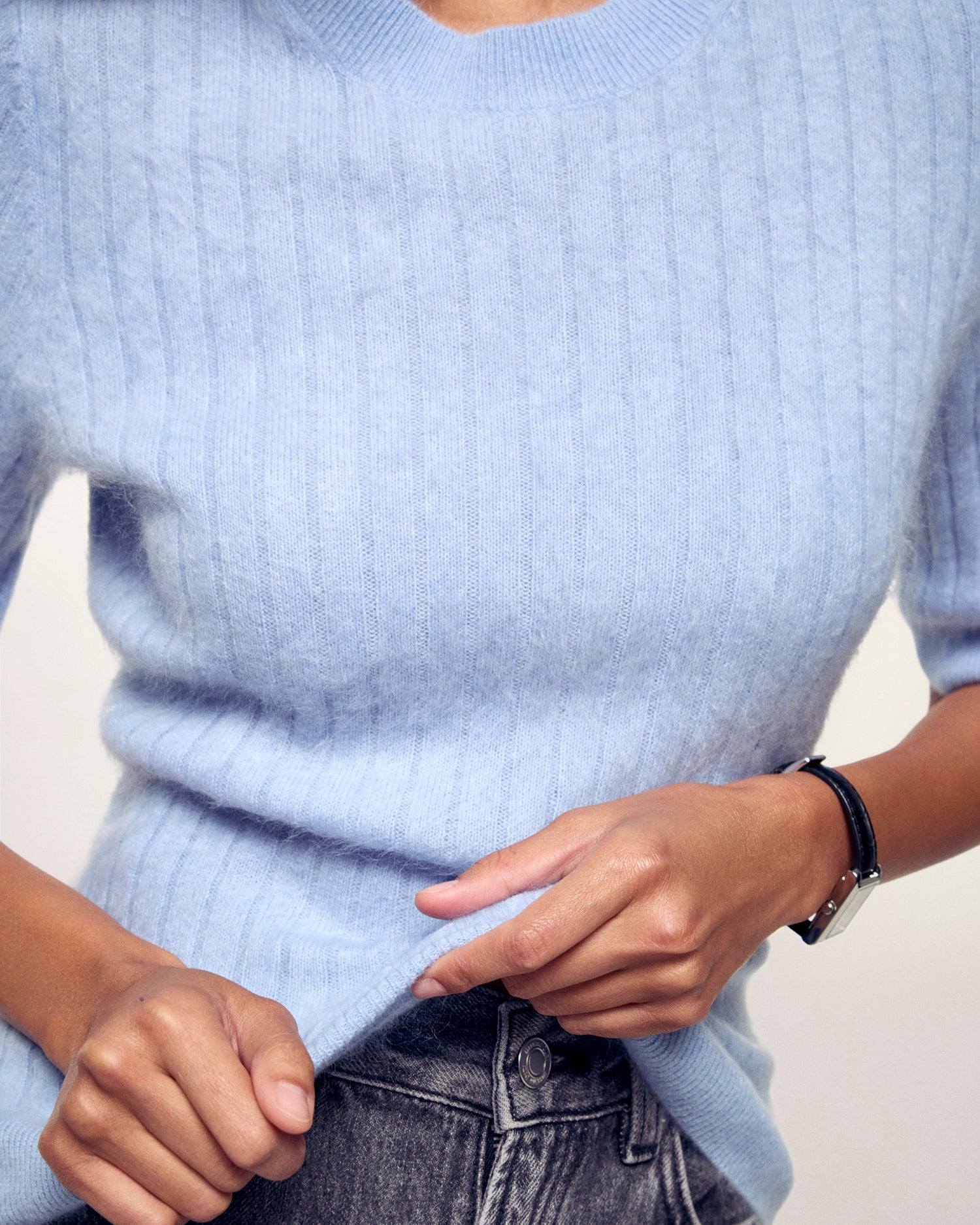 A soft and modern cashmere top featuring short sleeves and textured vertical stripes. - Short-sleeve top in GCS-certified 2-ply cashmere - Textured vertical stripes - Brushed knit - Regular fit - 2-ply cashmere - The Good Cashmere Standard® (GCS) is an independent standard for sustainable cashmere, that aims to improve the welfare of cashmere goats, the working conditions of farmers and to protect the environment.