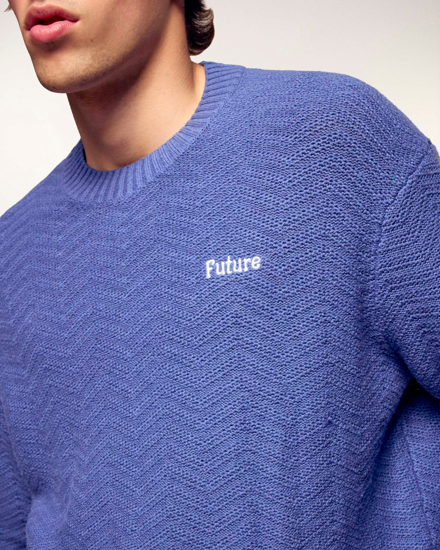 This crewneck sweater revisits essentials with a detailed texture and optimal comfort. Crafted from a soft blend of cotton and cashmere, it stands out with a plain knit play that gives it a subtle and modern relief. Its oversize fit features our "Future" signature delicately embroidered on the chest, for a look that is both relaxed and polished.
