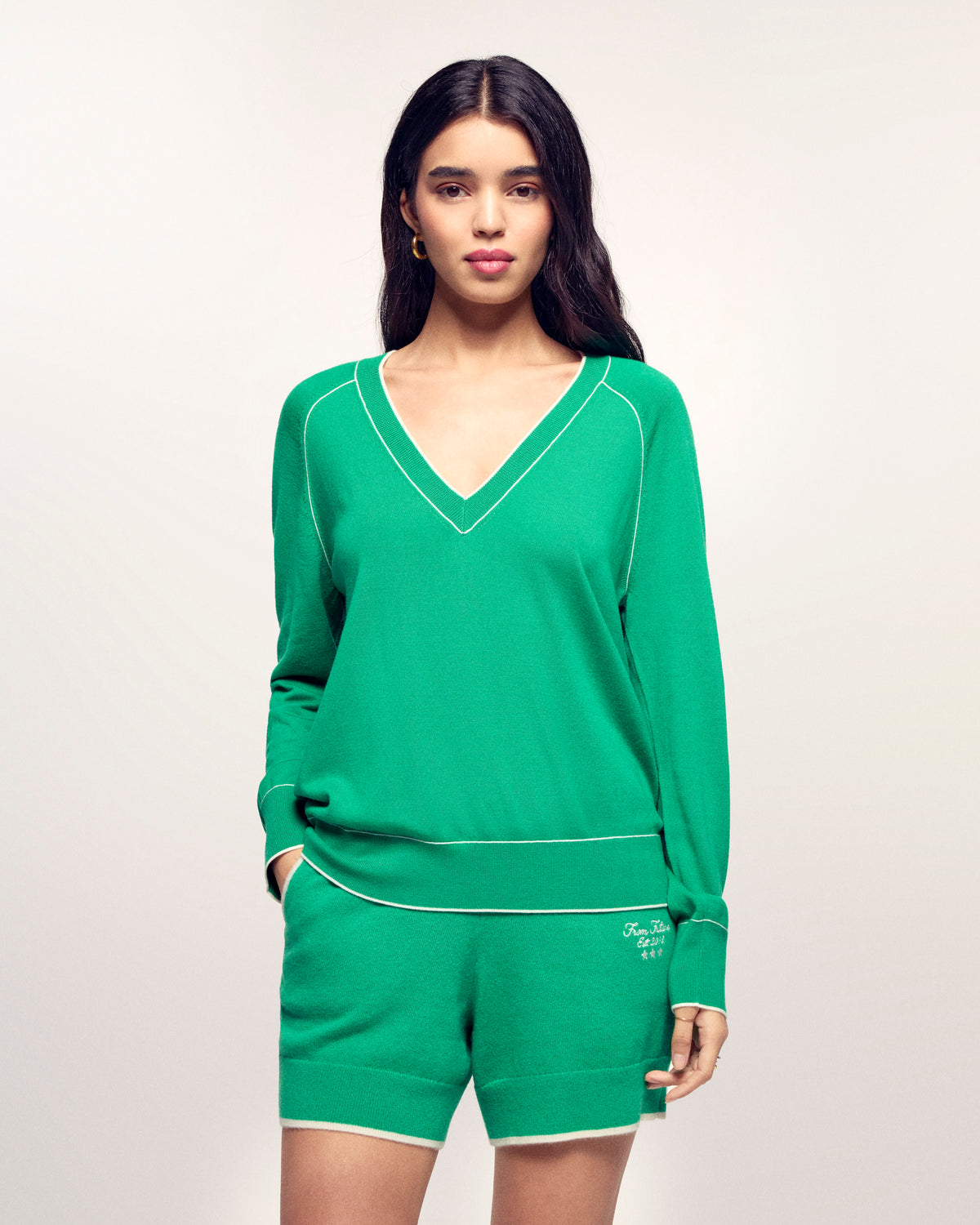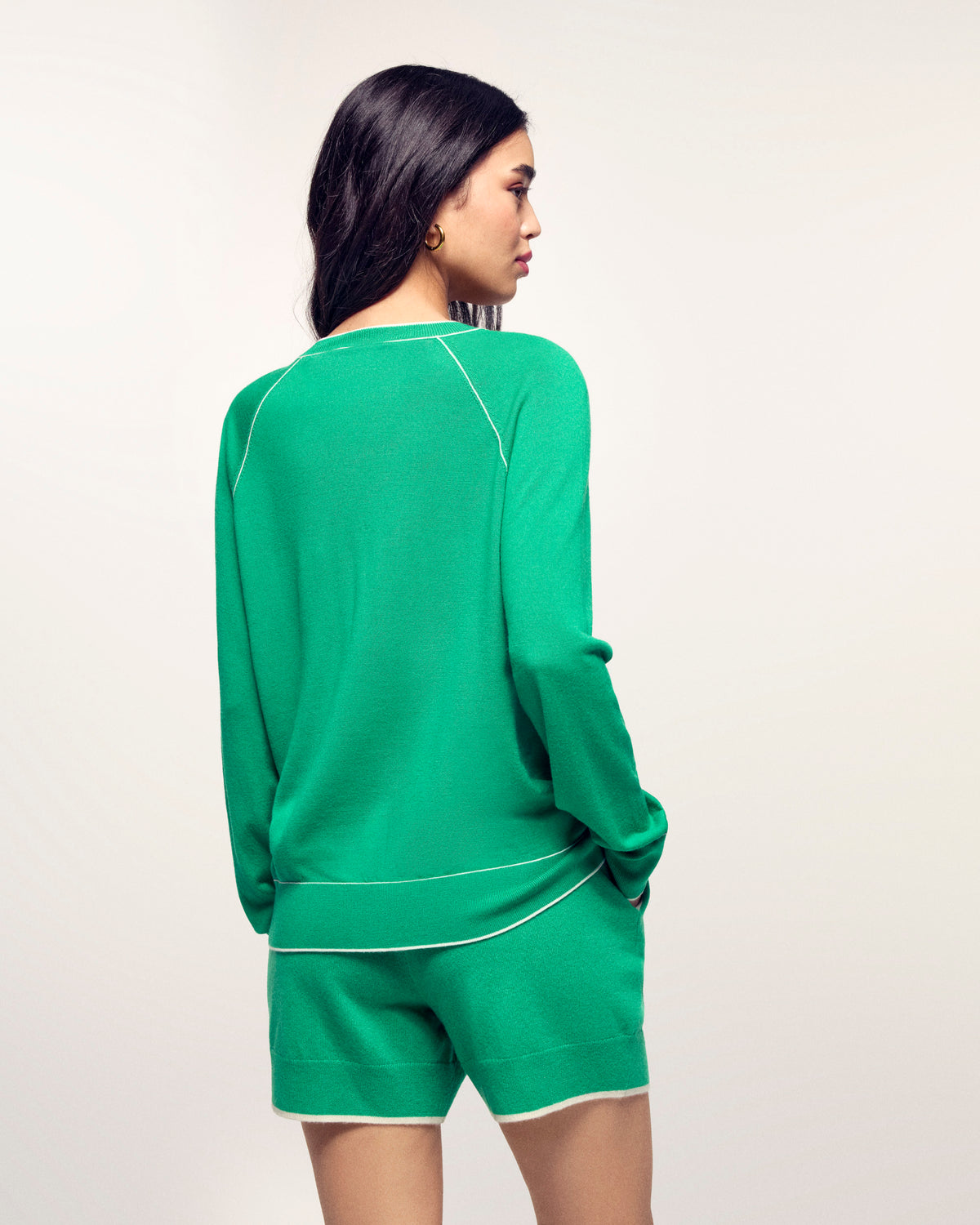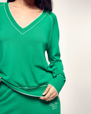 The V-neck sweater that enhances your outfit. Crafted from 2-ply Extrafine Merino Wool, this sweater offers a soft and light knit. Its timeless regular fit is boosted by contrasting trims that frame the collar, highlight the raglan armholes, and finish the ribbed edges.