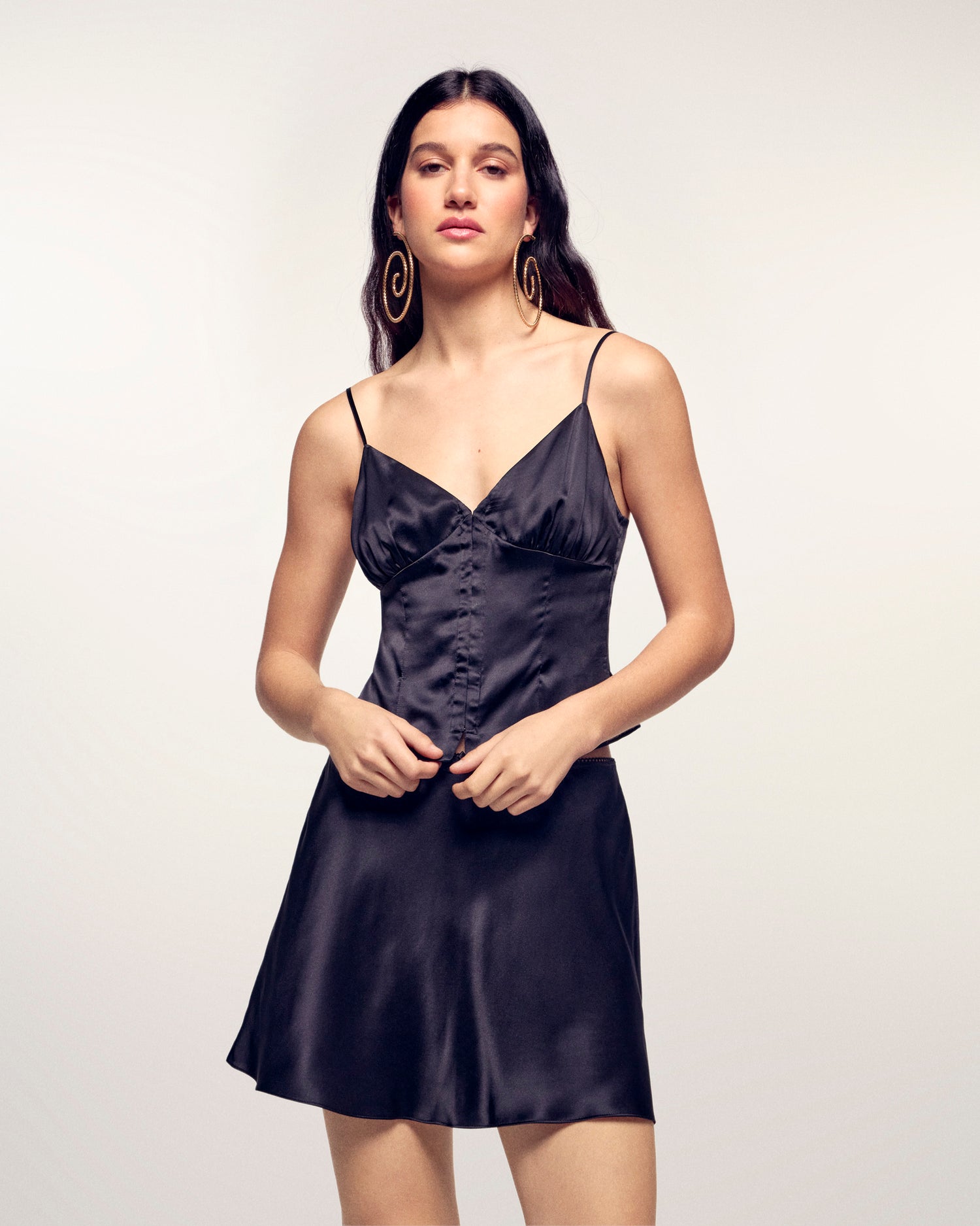 A statement piece with couture accents that elegantly structures the silhouette. This satin top stands out with gathered details across the bust and a front opening finished with hook fastenings, creating a look that is both sophisticated and distinctly modern.