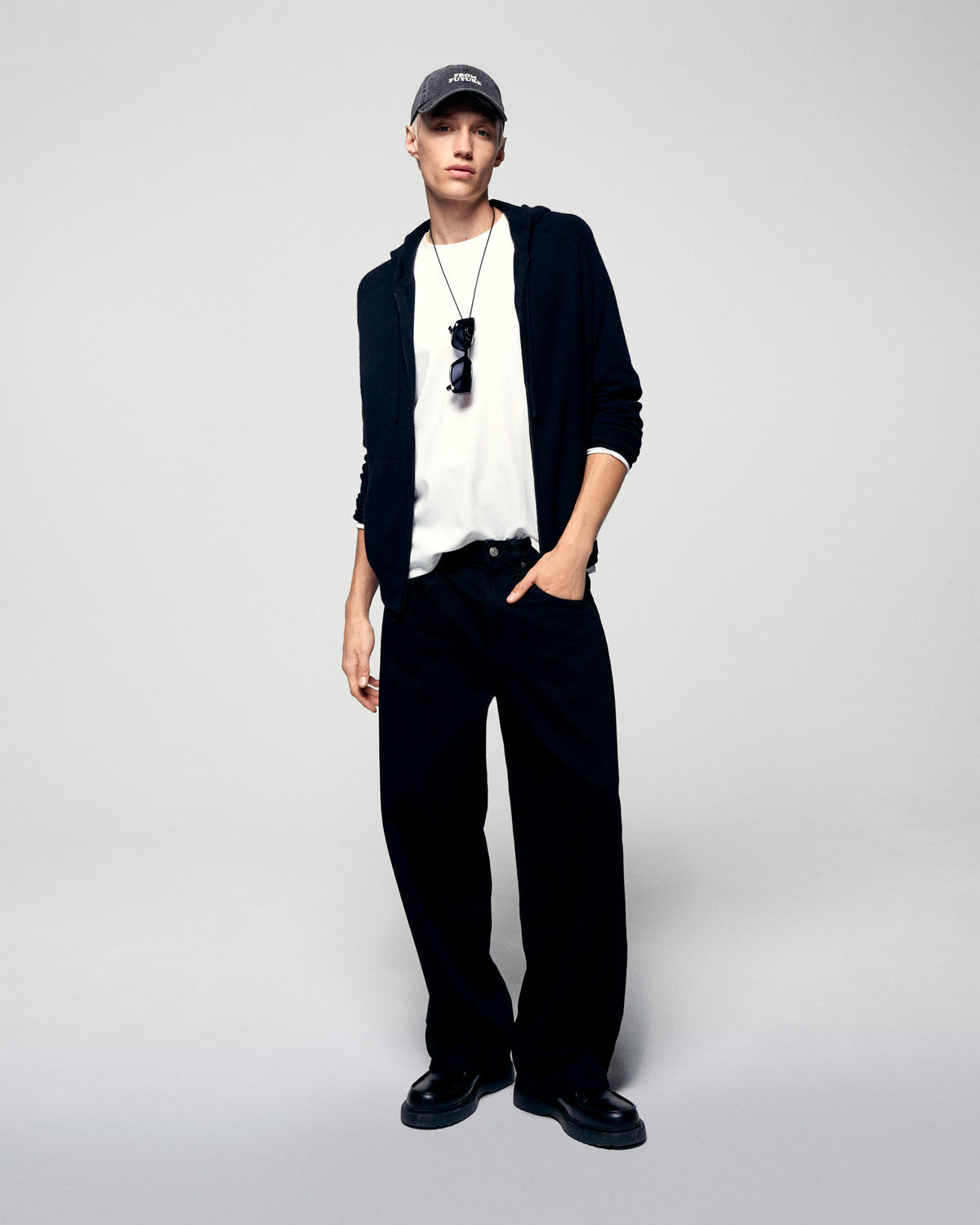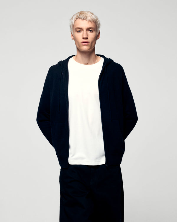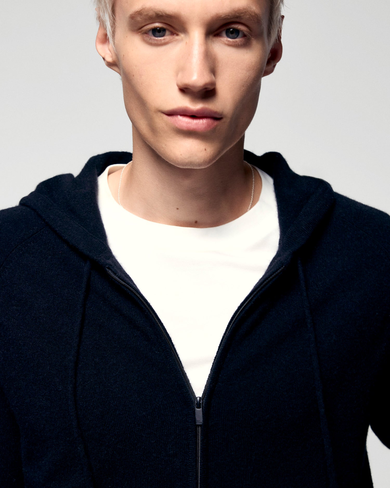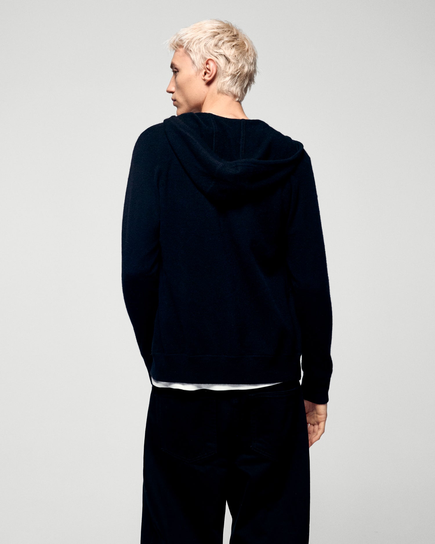 Crafted from 2-ply cashmere, this zipped hoodie sweater features long sleeves, a drawstring hood and a front pocket. Pair it with your favorite denim to create a perfect look.