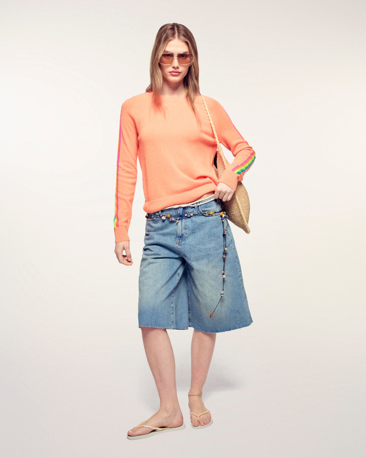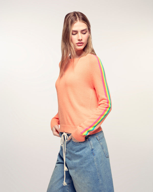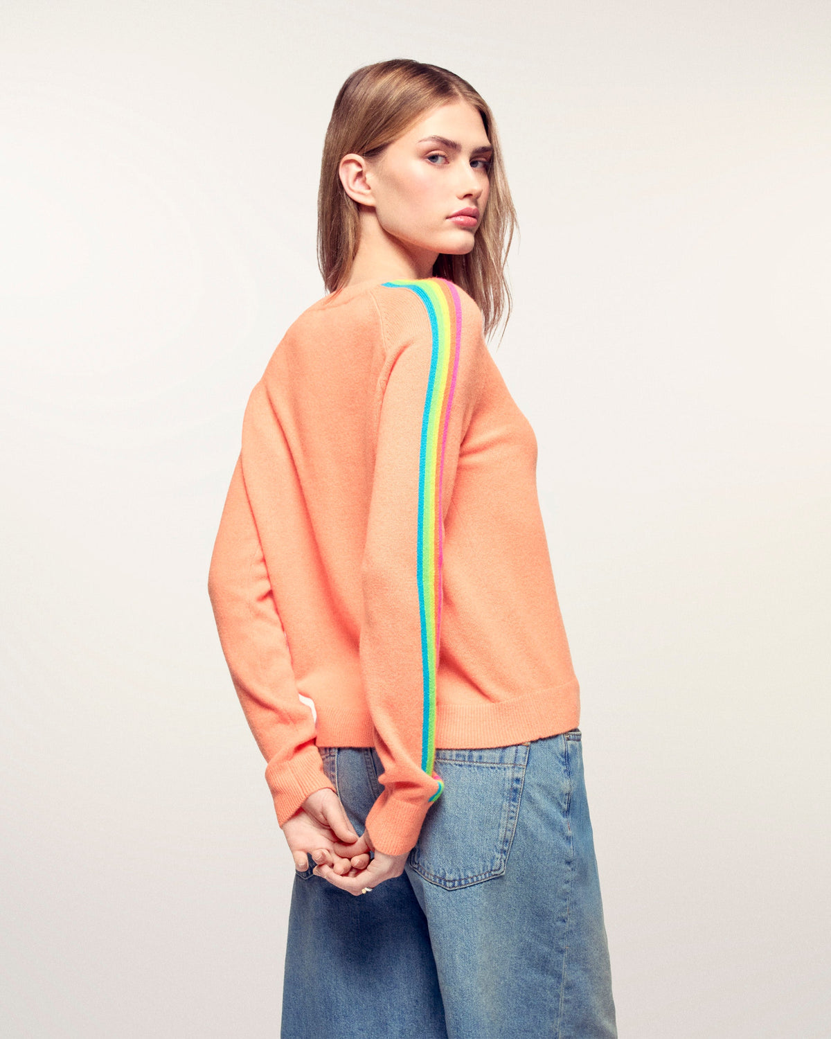 The elegance of cashmere meets bold colors with this crewneck sweater. Crafted from 2-ply cashmere, it offers incomparable softness and ideal lightness. Its multicolored stripes on the sleeves, a true signature, energize its regular fit for a look that is both modern and timeless.