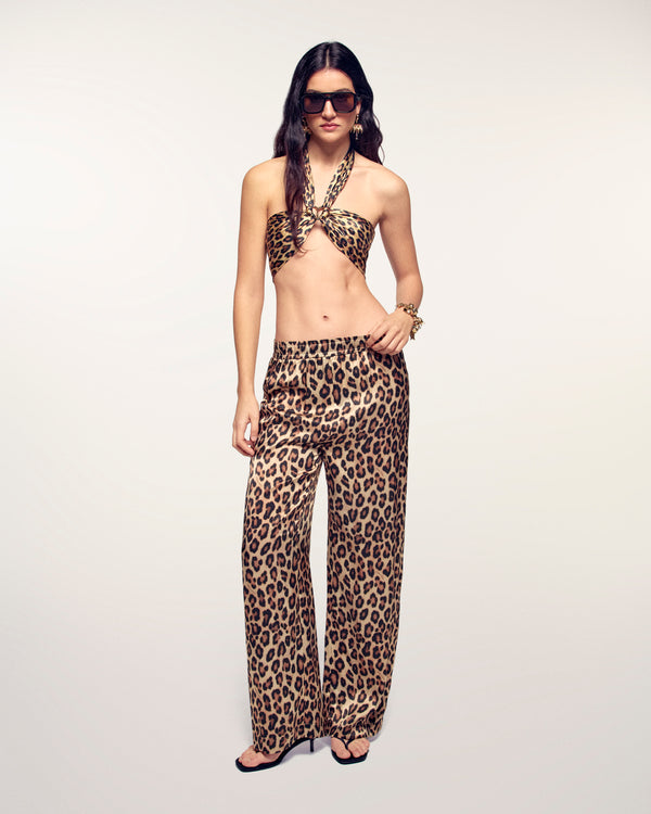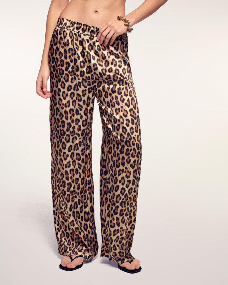 Crafted from shiny satin silk, these wide-leg pants features a bold leopard print. The elasticated waist ensure a flattering fit and a flowing silhouette.