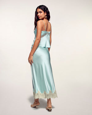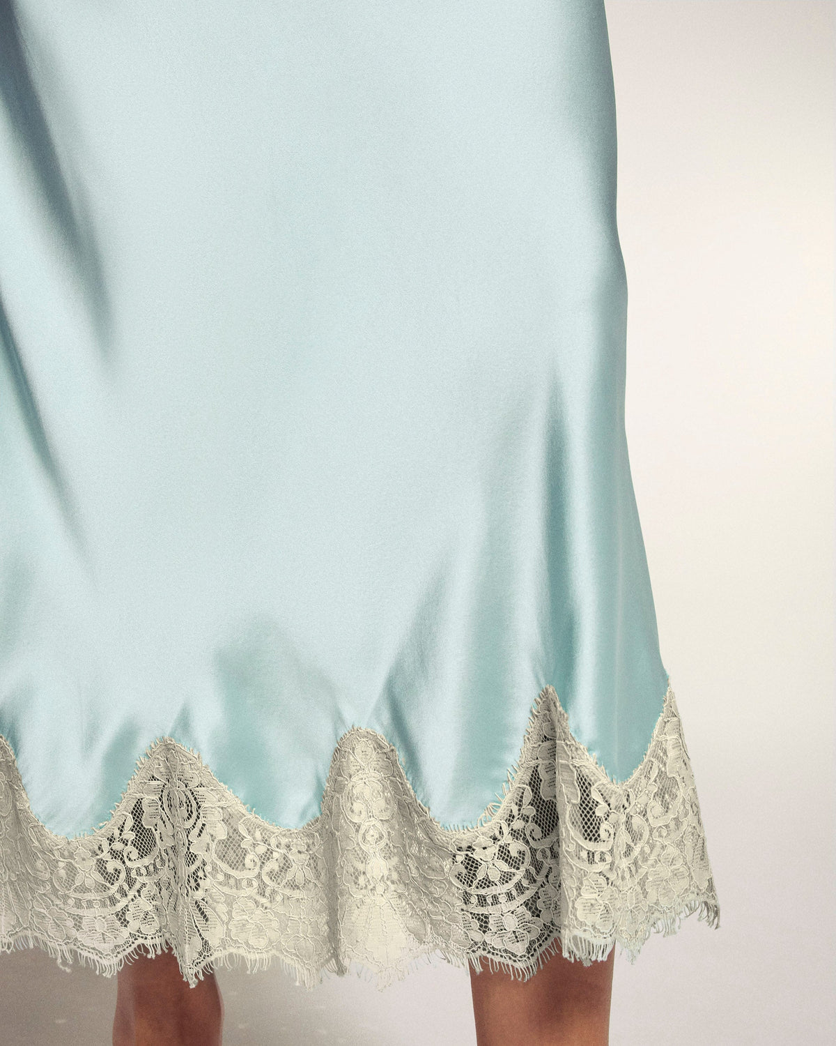 This midi skirt embodies romantic and airy elegance. Entirely crafted from silk, it features delicate lace inserts that play with transparency. Its elasticated waist ensures perfect comfort while highlighting a feminine and refined silhouette, ideal for beautiful summer days.
