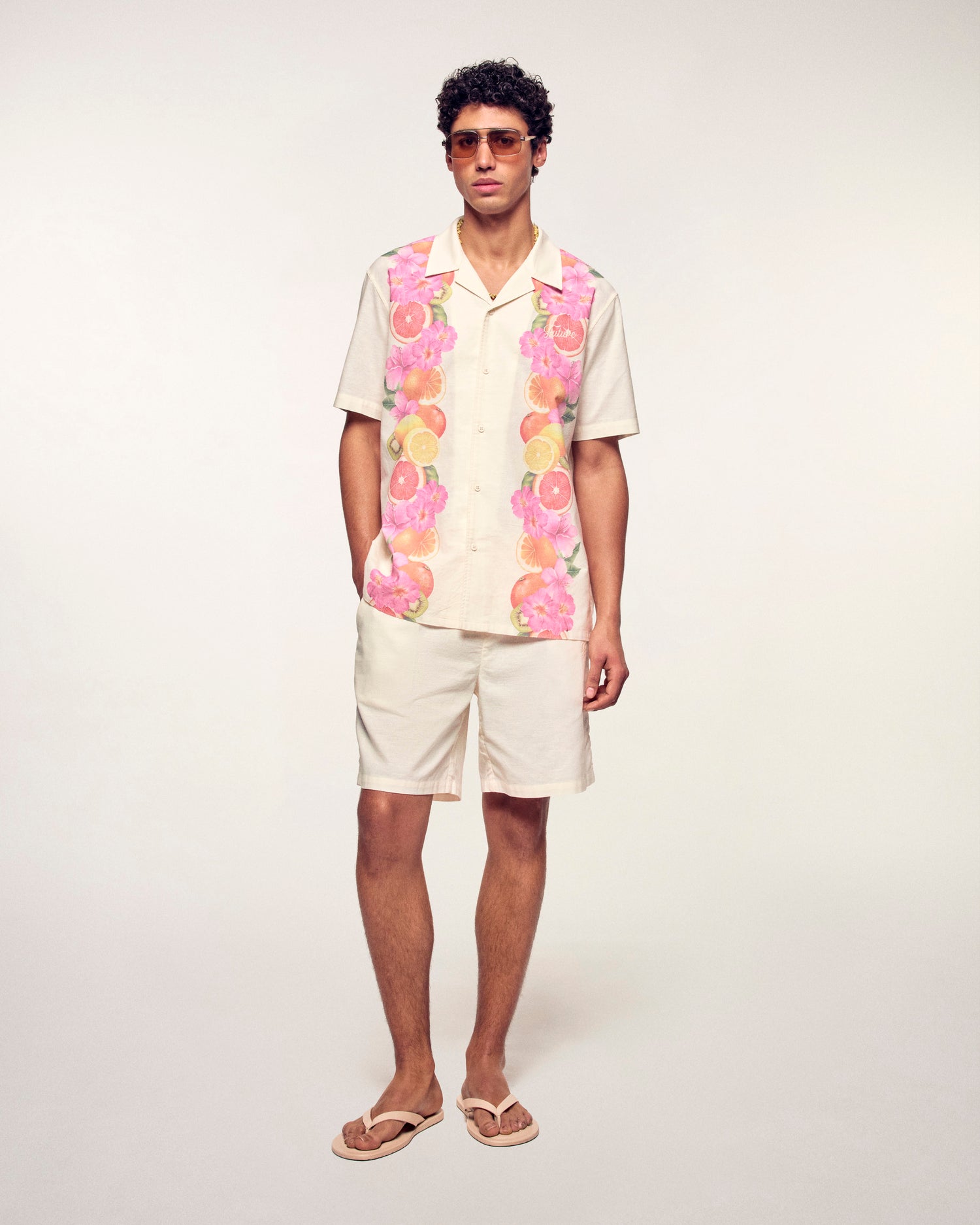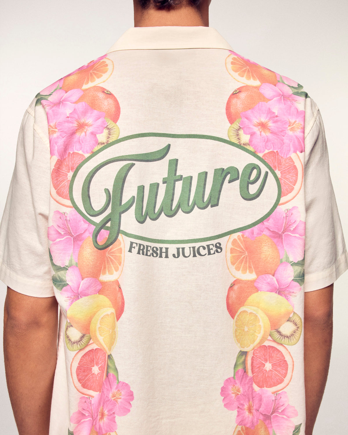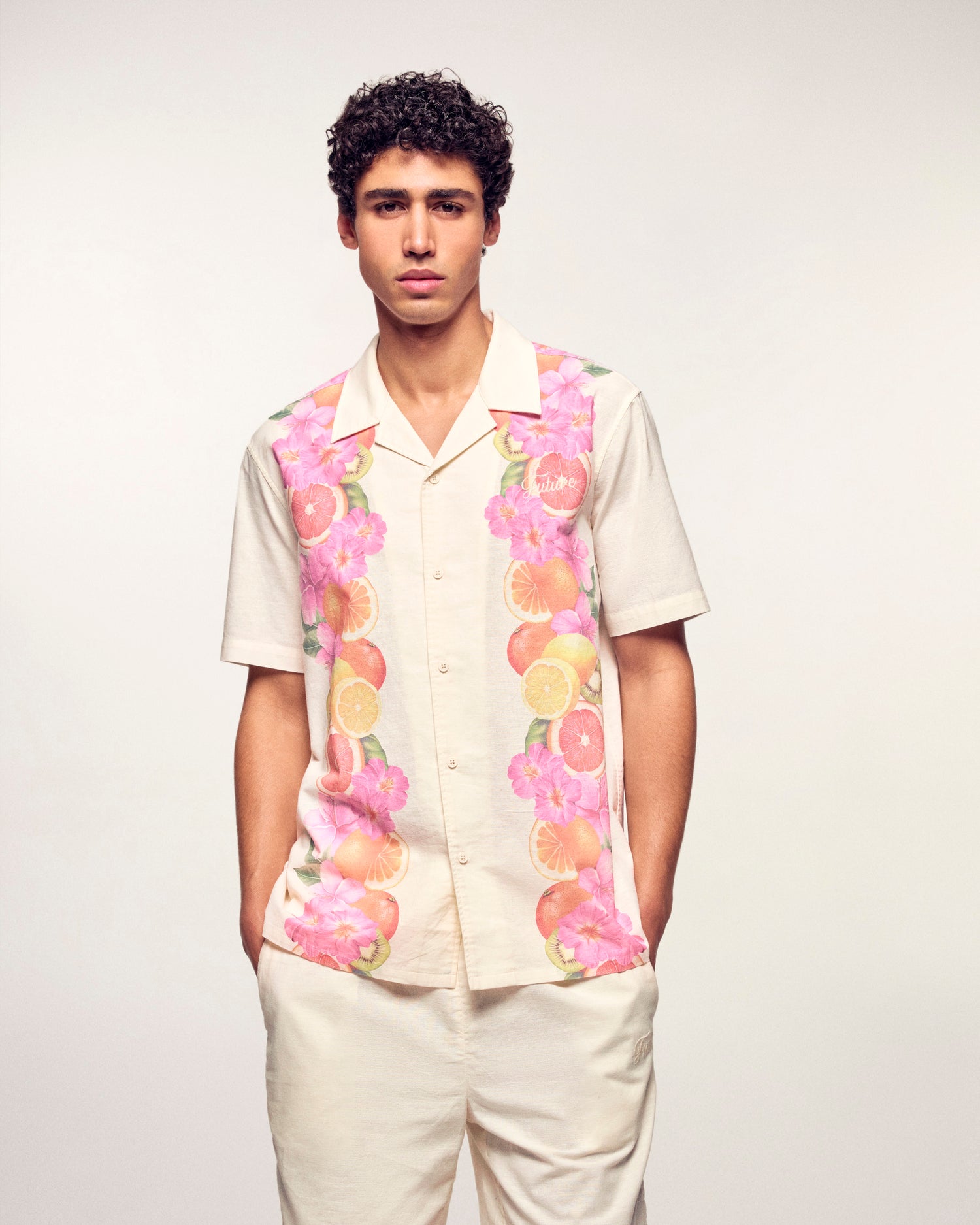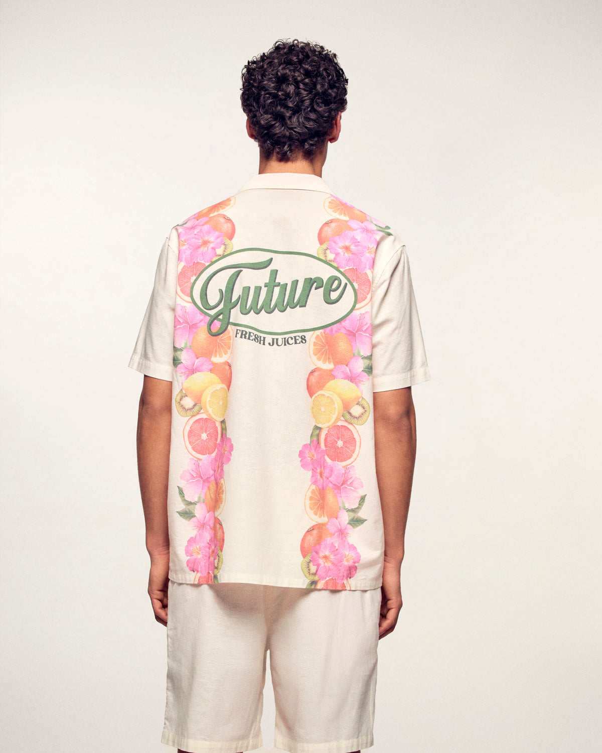 A centerpiece of our Brazil-themed summer collection, this short-sleeved shirt brings exoticism and freshness to your wardrobe. Crafted from a noble blend of linen and cotton, it stands out with its exclusive frieze print composed of tropical fruits and colorful flowers. The back features the "FUTURE Fresh Juices" logo, capturing the sunny and vibrant spirit of the season.