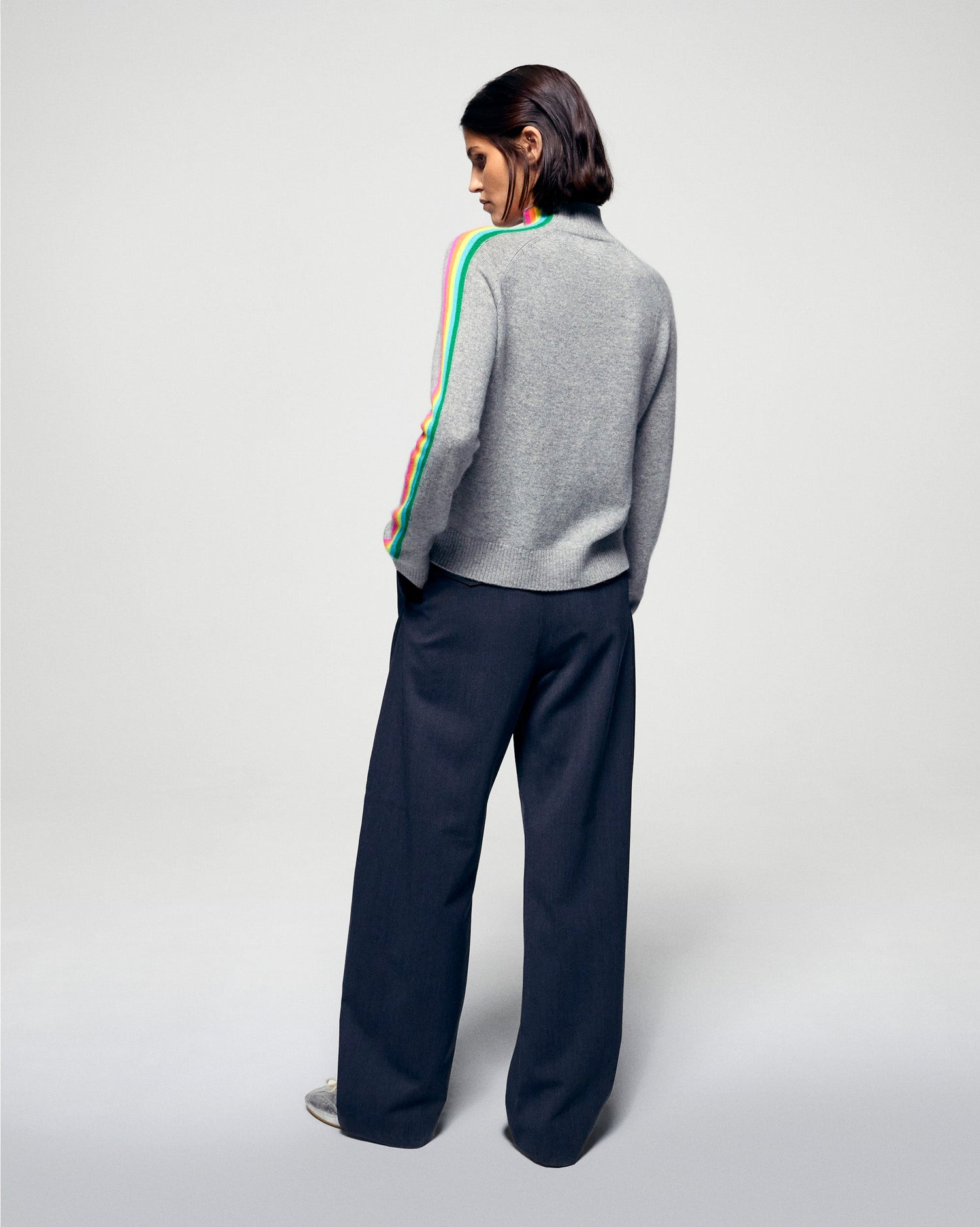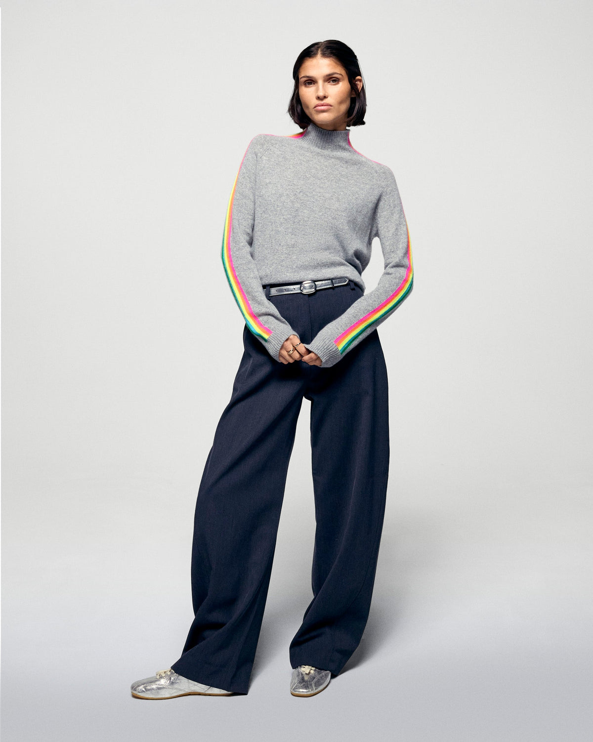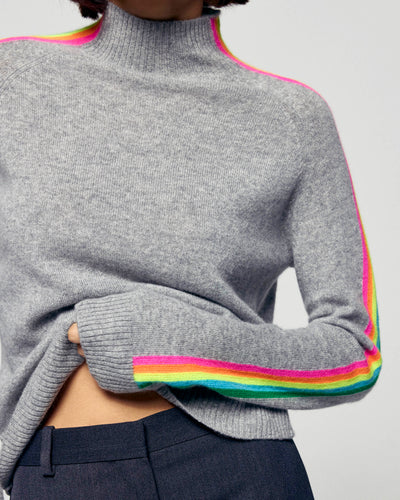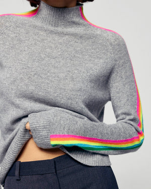 Crafted from soft and lightweight cashmere, this short sweater reveals vibrant colored bands along the sleeves. Featuring a mock neck and ribbed edges, it pairs easily with loose jeans or a flowing skirt.