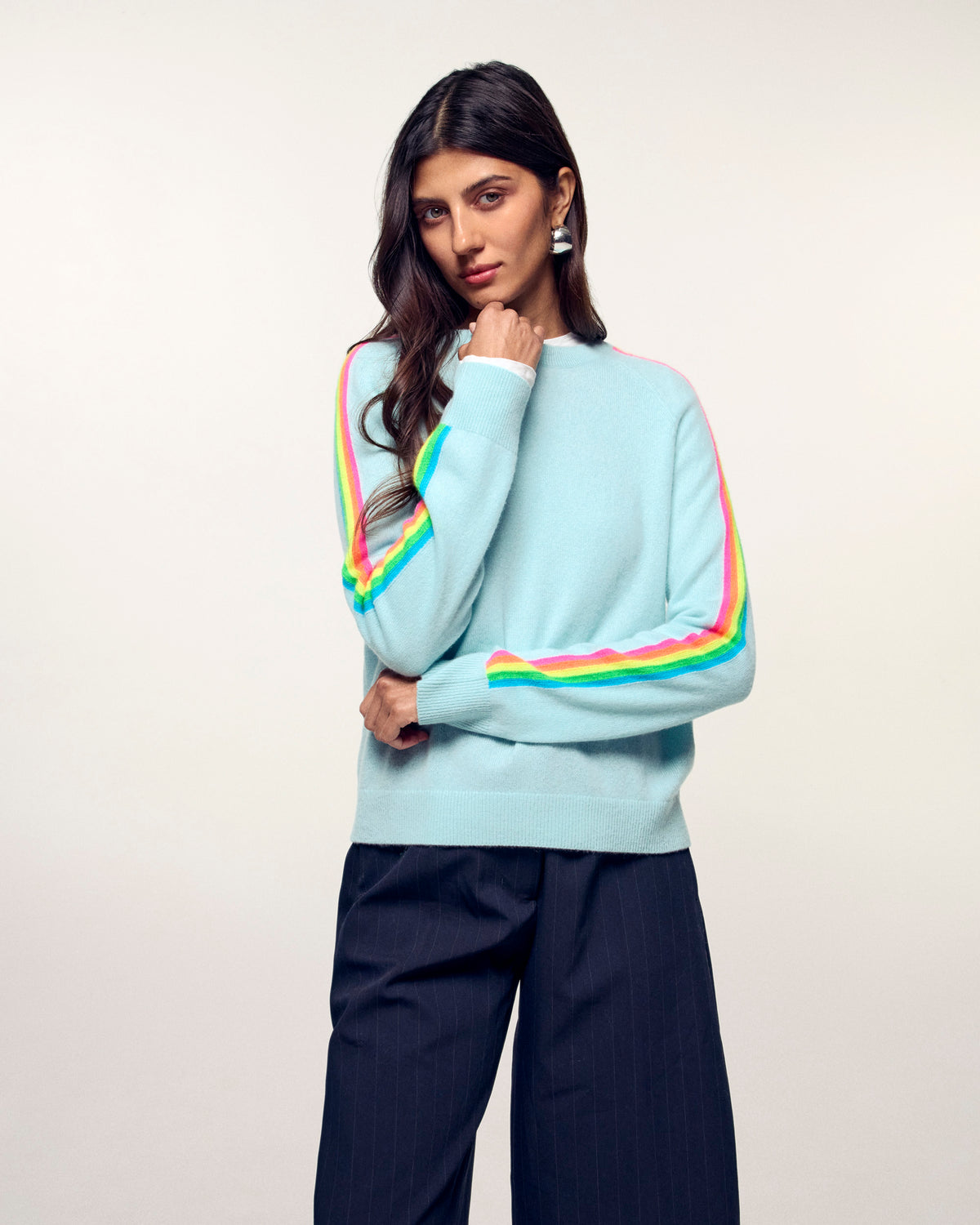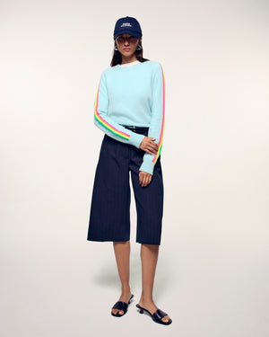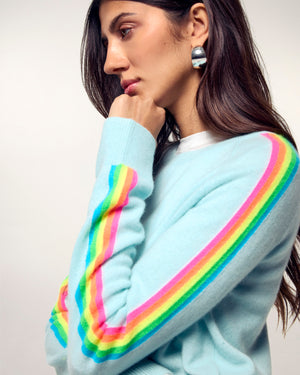 The elegance of cashmere meets bold colors with this crewneck sweater. Crafted from 2-ply cashmere, it offers incomparable softness and ideal lightness. Its multicolored stripes on the sleeves, a true signature, energize its regular fit for a look that is both modern and timeless.