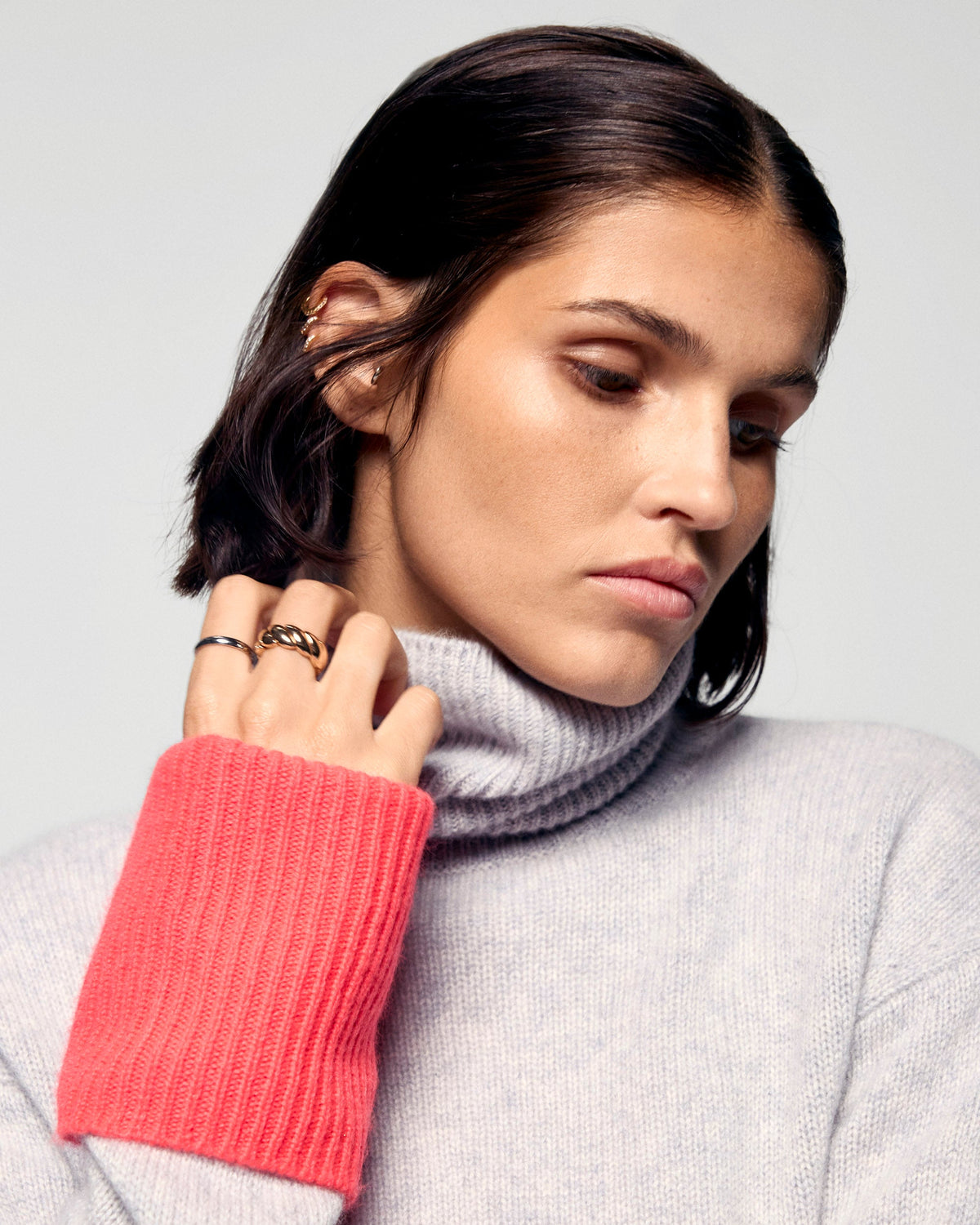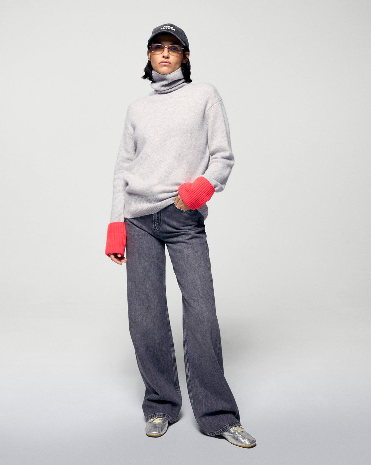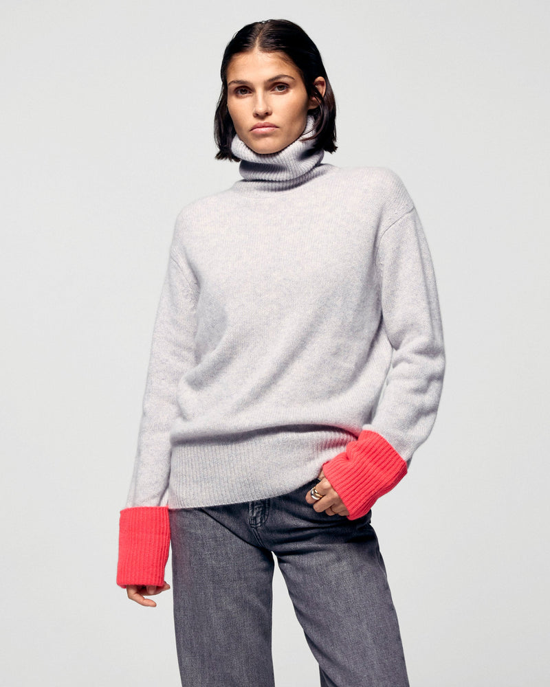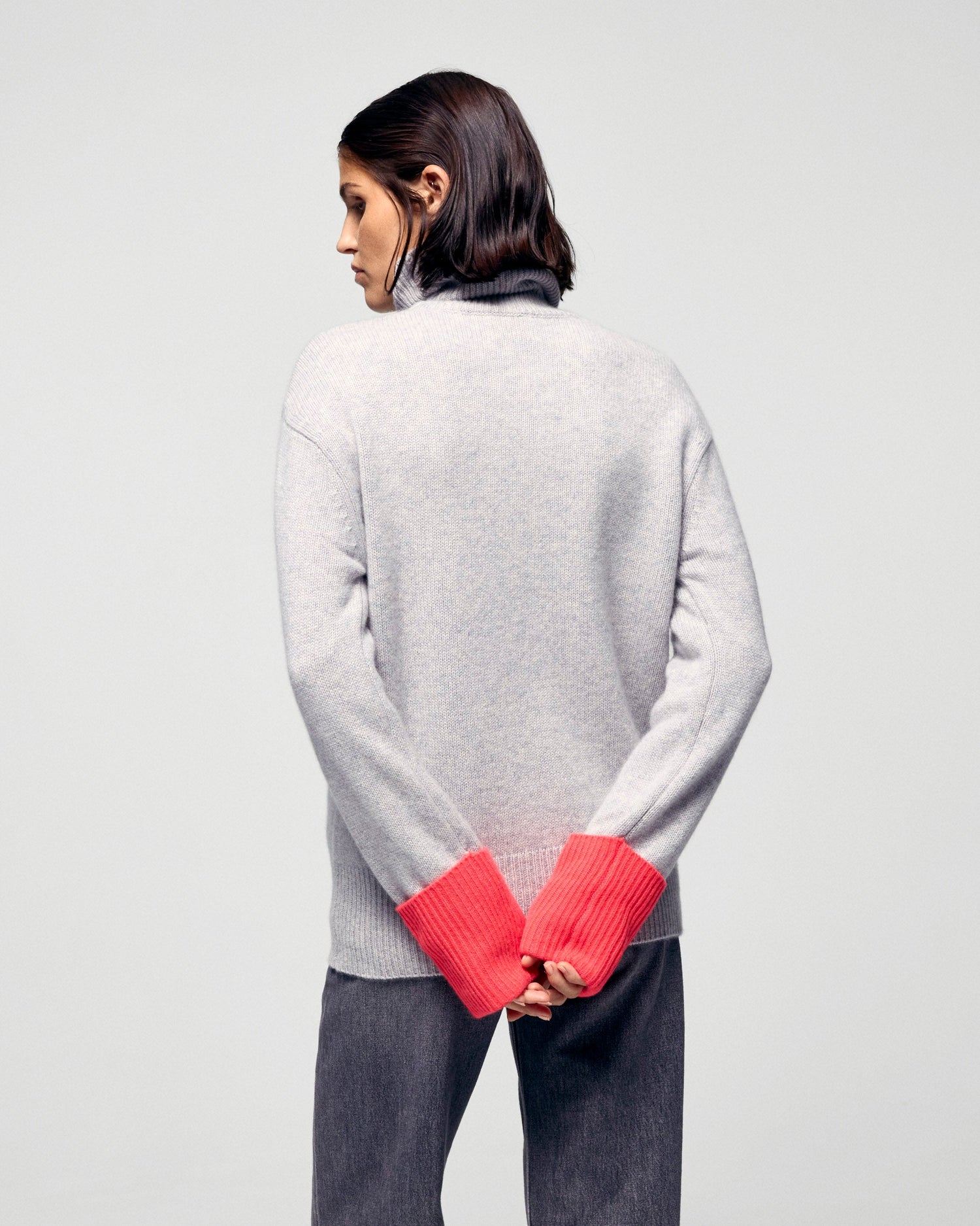 Make a statement with our oversized and long cashmere sweater. With long sleeves and a turtleneck, it reveals contrasting ribbed cuffs, adding a playful twist to your silhouette. Pair it with your favorite denim or a flowing skirt for a chic and casual look.