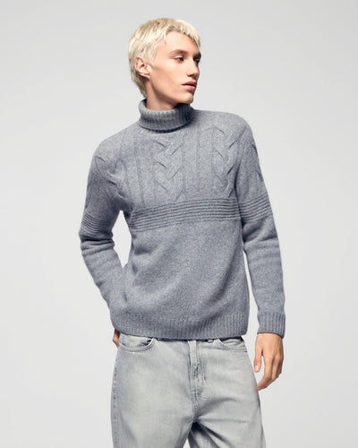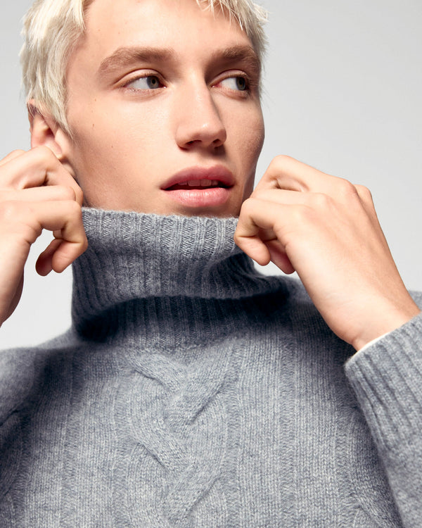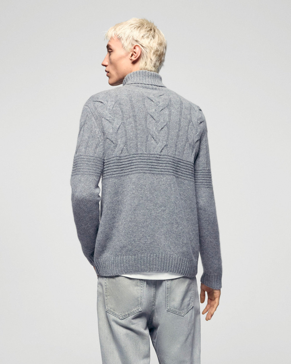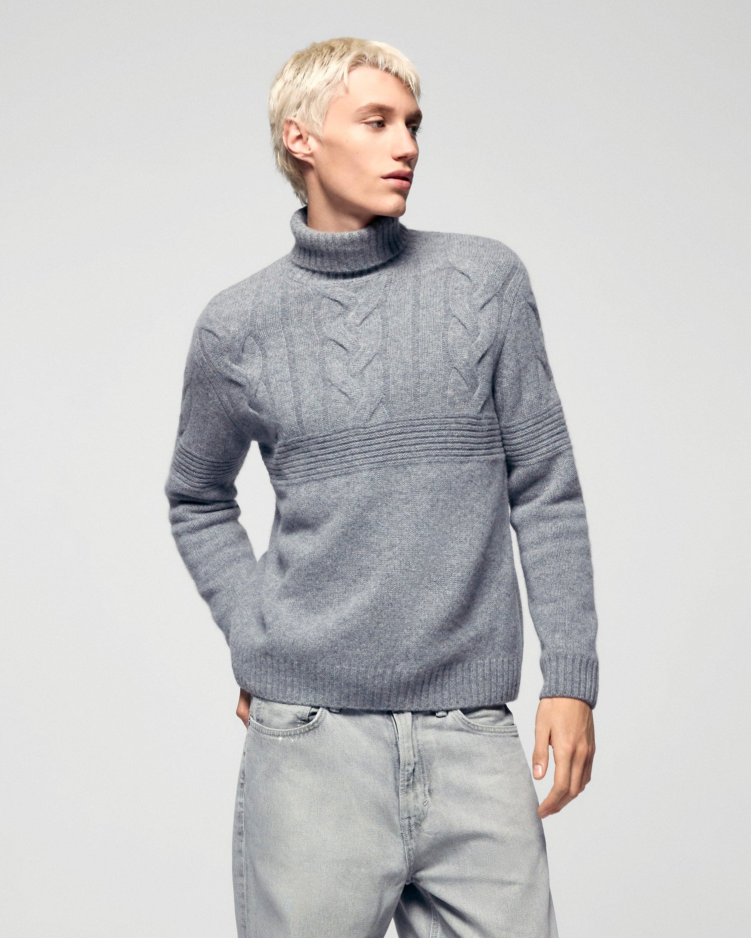 This cropped cashmere sweater is adorned with twisted knit. Complete with a turtleneck, long sleeves, and ribbed edges, it embodies timeless elegance. Pair it with tailored trousers and a blazer for a sophisticated ensemble.
