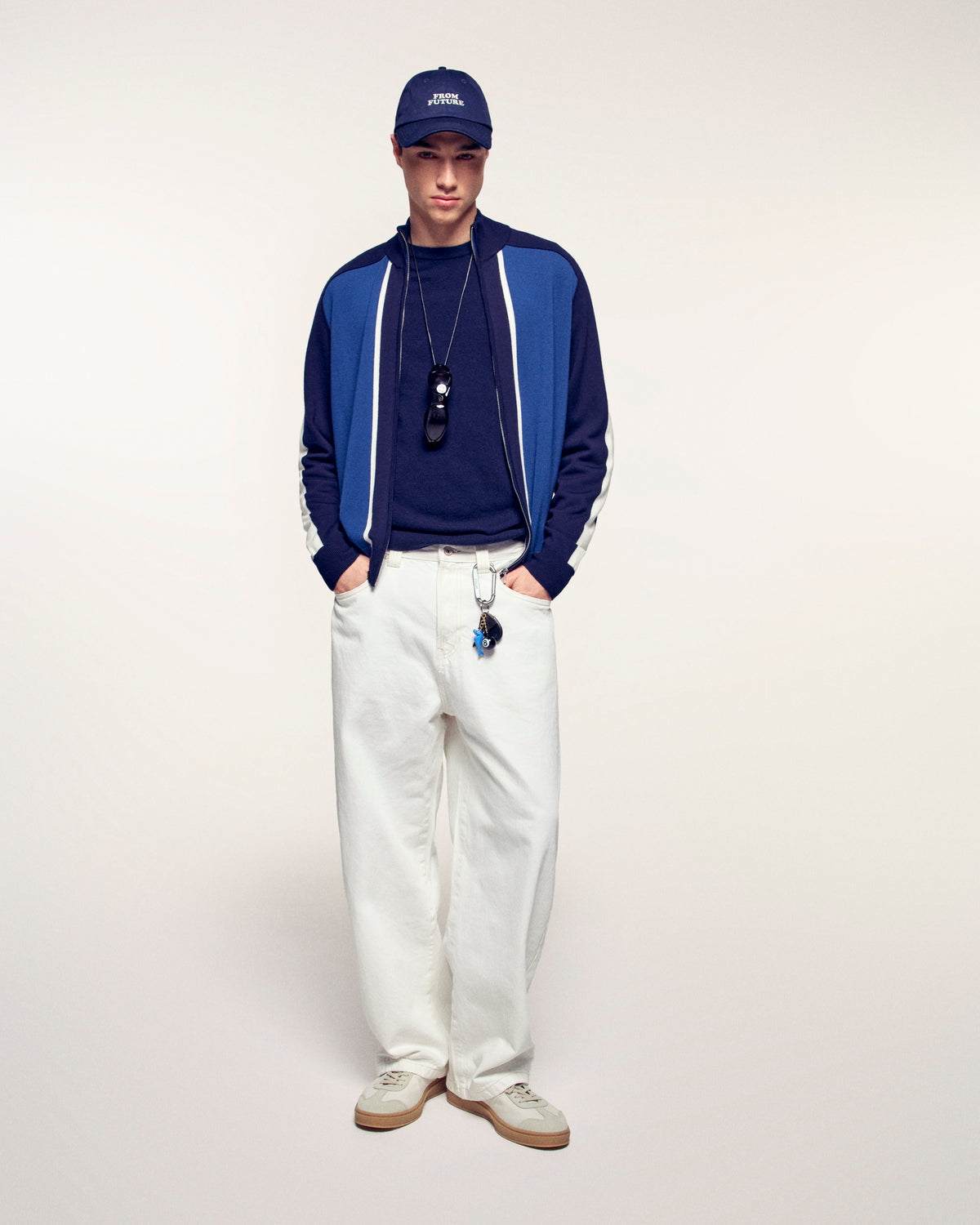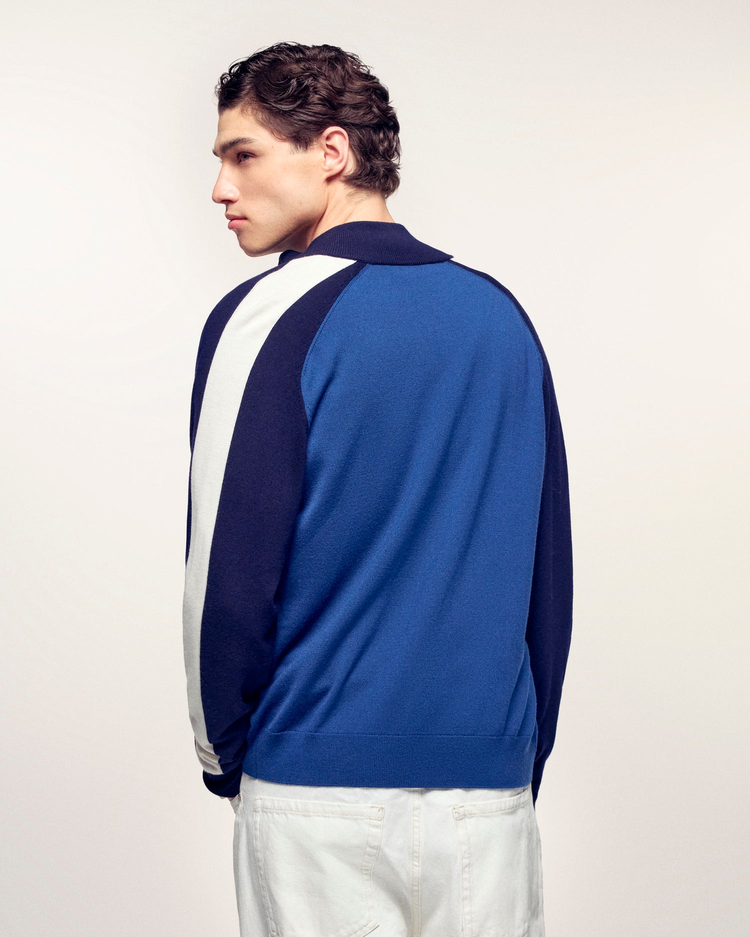 This two-tone cardigan, inspired by chic sportswear, is crafted from pure extra-fine merino wool. Its structured tricolor knit and contrasting stripes on the sleeves make it a strong and timeless piece.