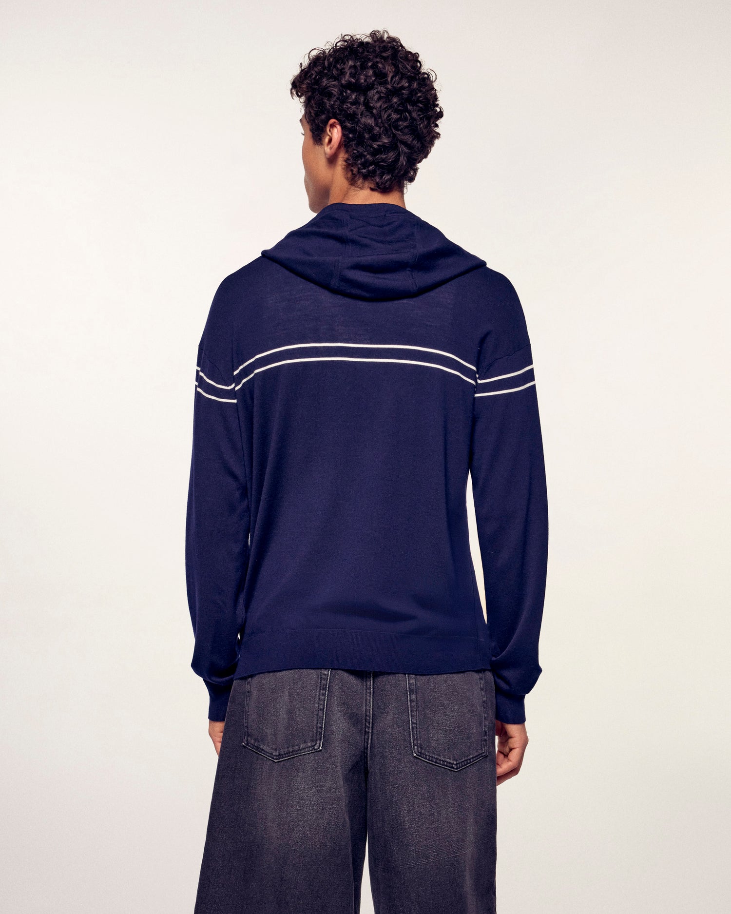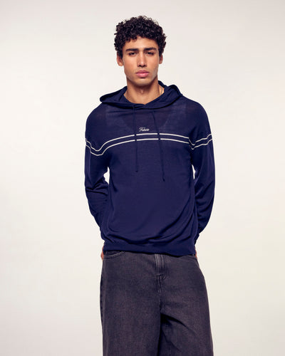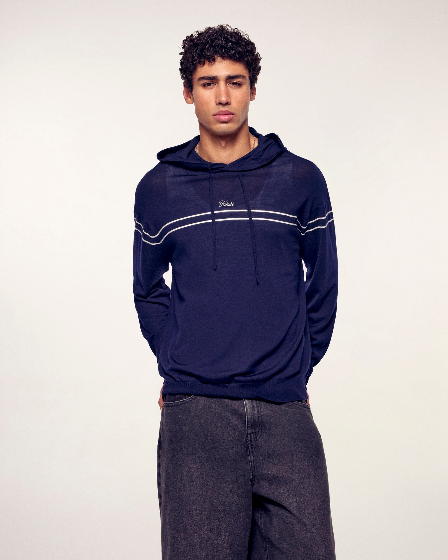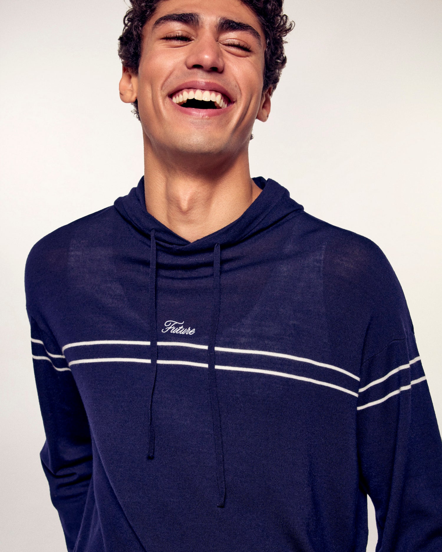 A hoodie sweater made from merino wool, featuring an urban and refined style enhanced by its “Future” Embroidery and fine horizontal stripes. Its careful finishes make it a versatile piece, ideal for a casual yet elegant look.