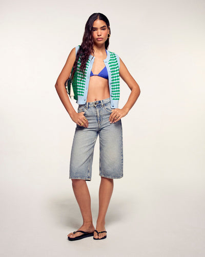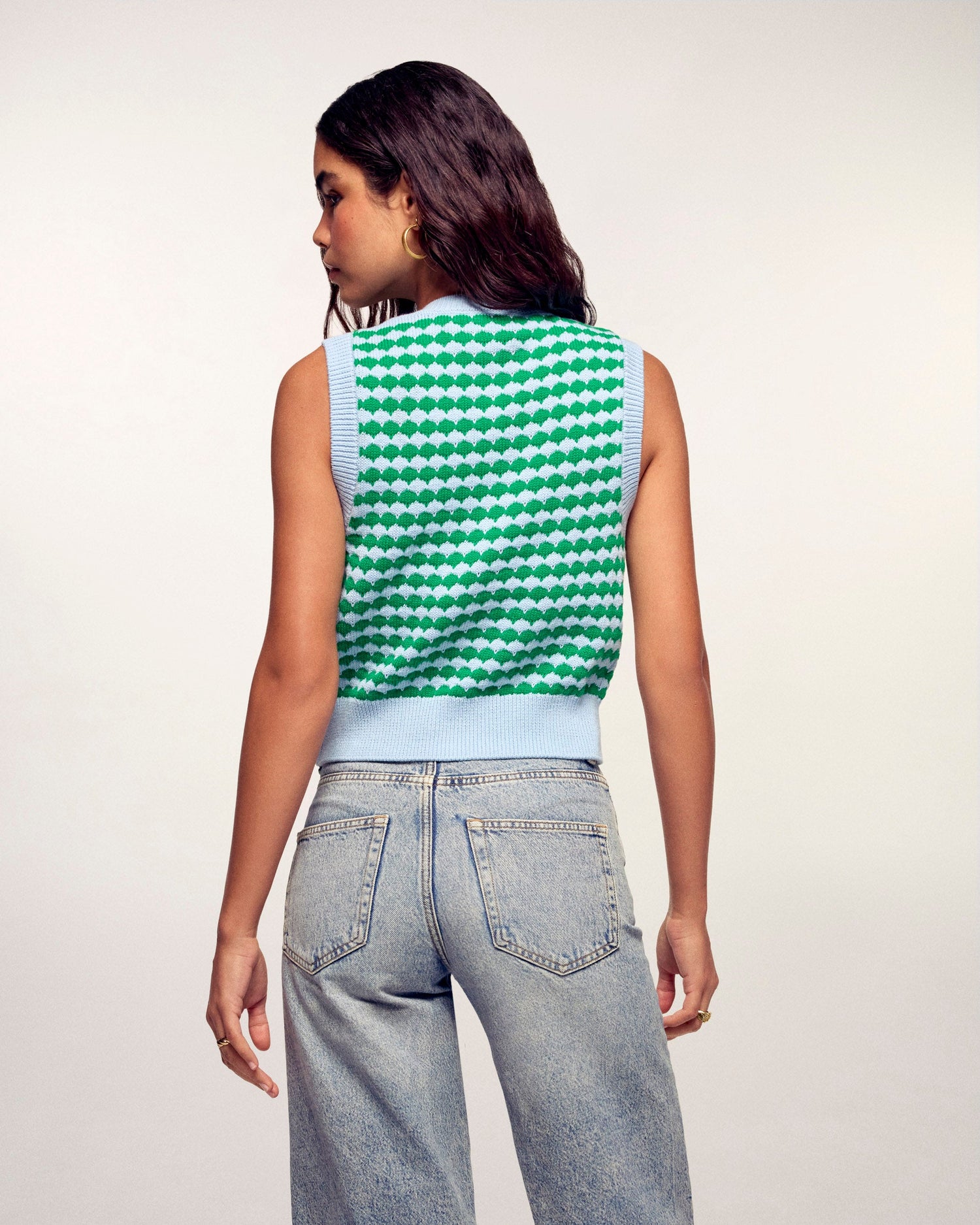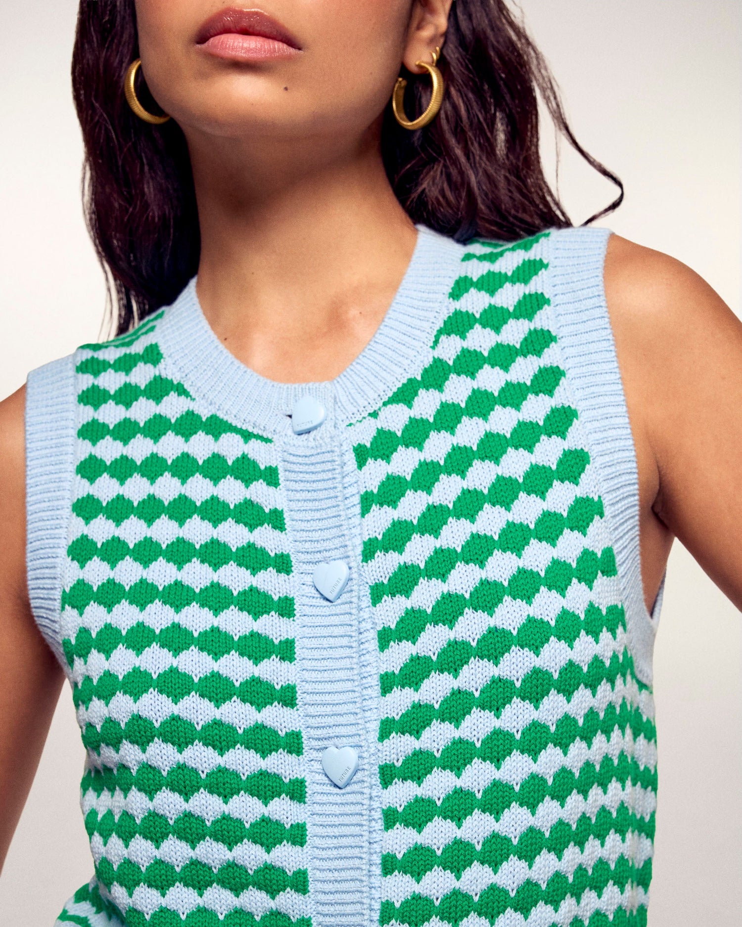 The sleeveless cardigan offers a playful and graphic look for the new season. Crafted from a soft blend of cotton and cashmere, it stands out with its textured two-tone stitch play and adorable heart-shaped buttons. Its regular and cropped fit makes it the ideal layering piece for a modern silhouette full of pep.