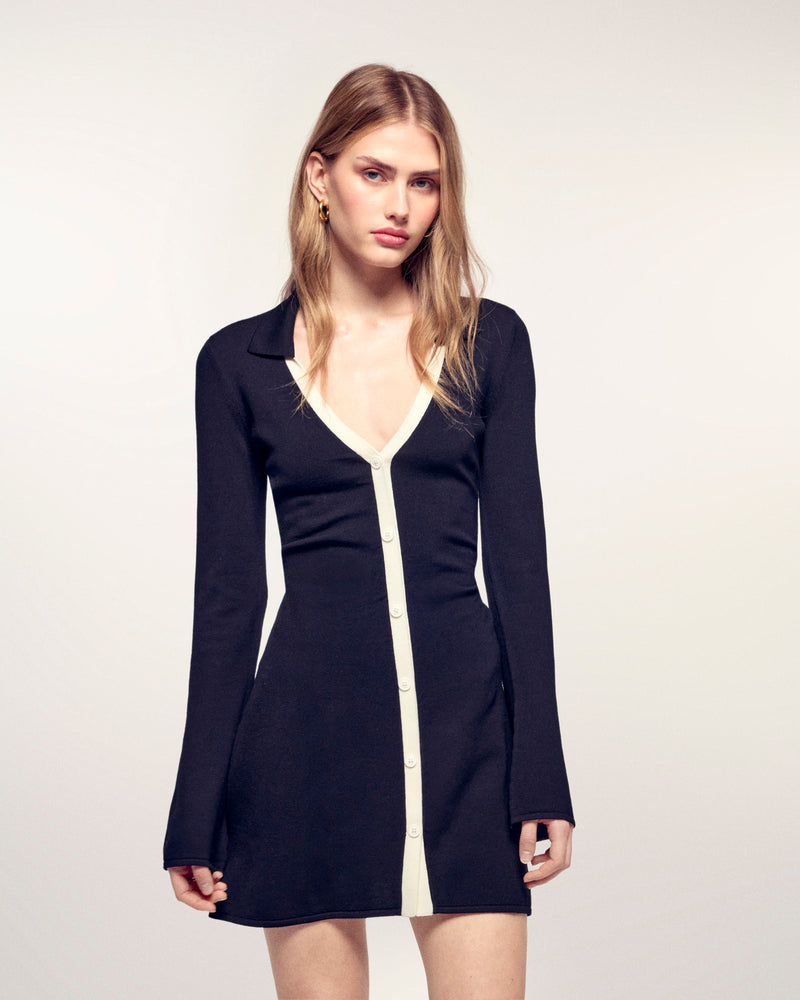 The dress that merges elegance and sportswear style. Crafted from 100% Extrafine Merino Wool, this piece is structured by a flattering slim fit and a shirt collar. The contrasting detail of the button placket adds a graphic and modern touch.
