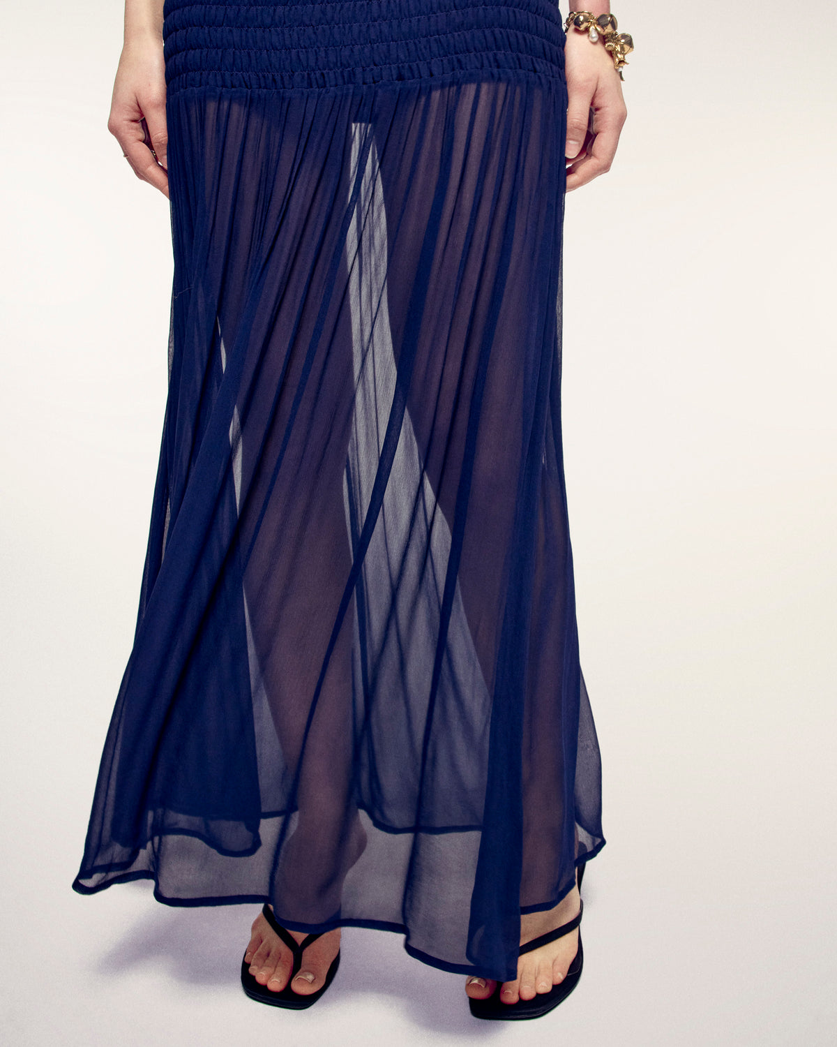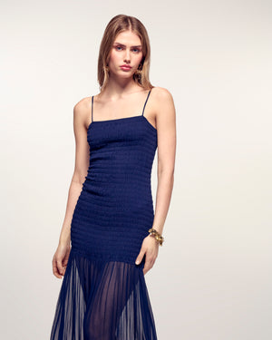 A bohemian and refined silhouette for this long dress that combines comfort and elegance. It stands out with its fully smocked top that delicately defines the waist before flowing into a fluid skirt, creating an airy look ideal for summer days and evenings.