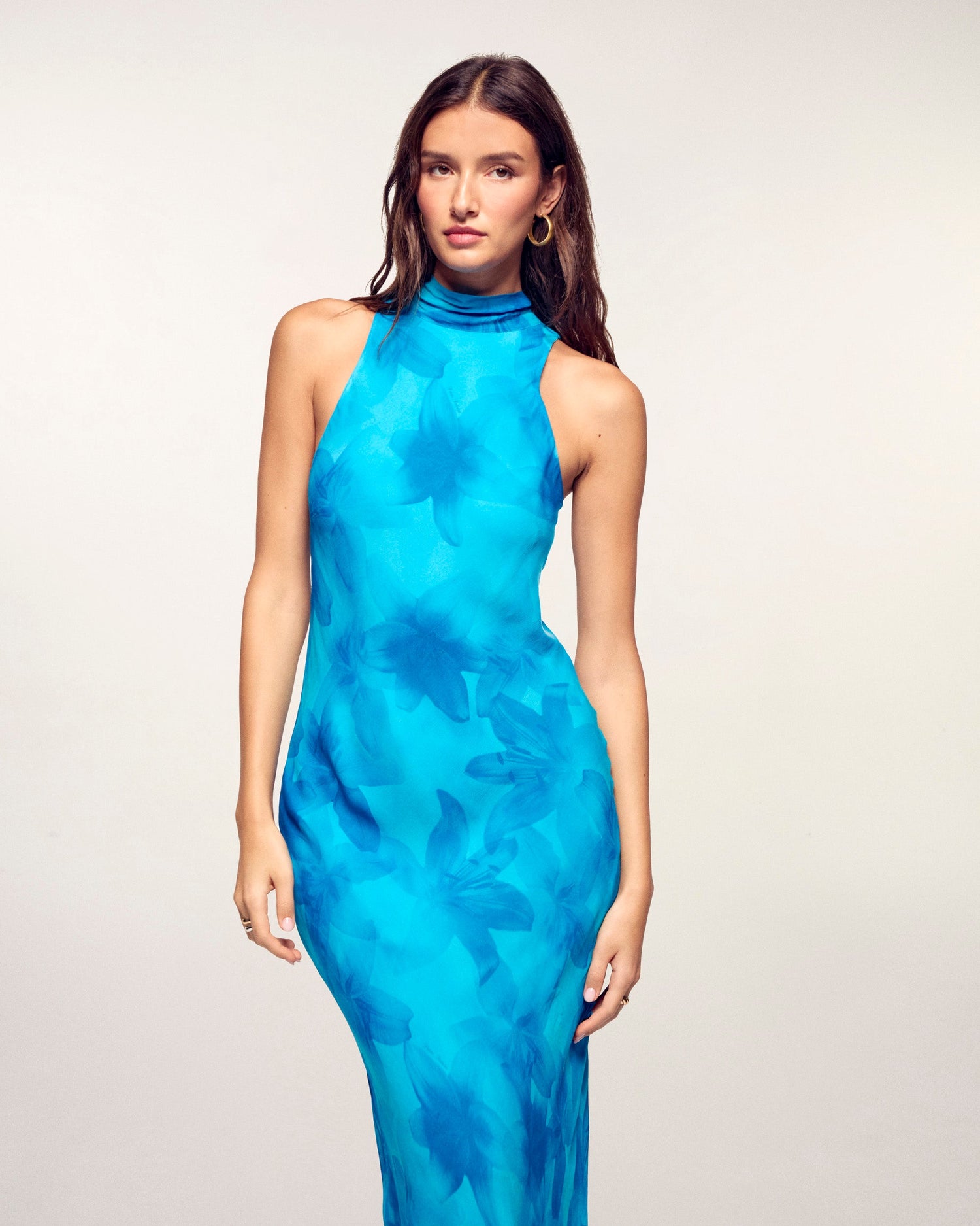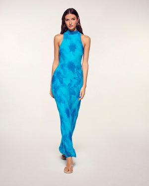 This long dress is crafted from light and fluid viscose chiffon. It features a fitted cut with a mock neck that extends into an elegant ribbon to be tied at the back.