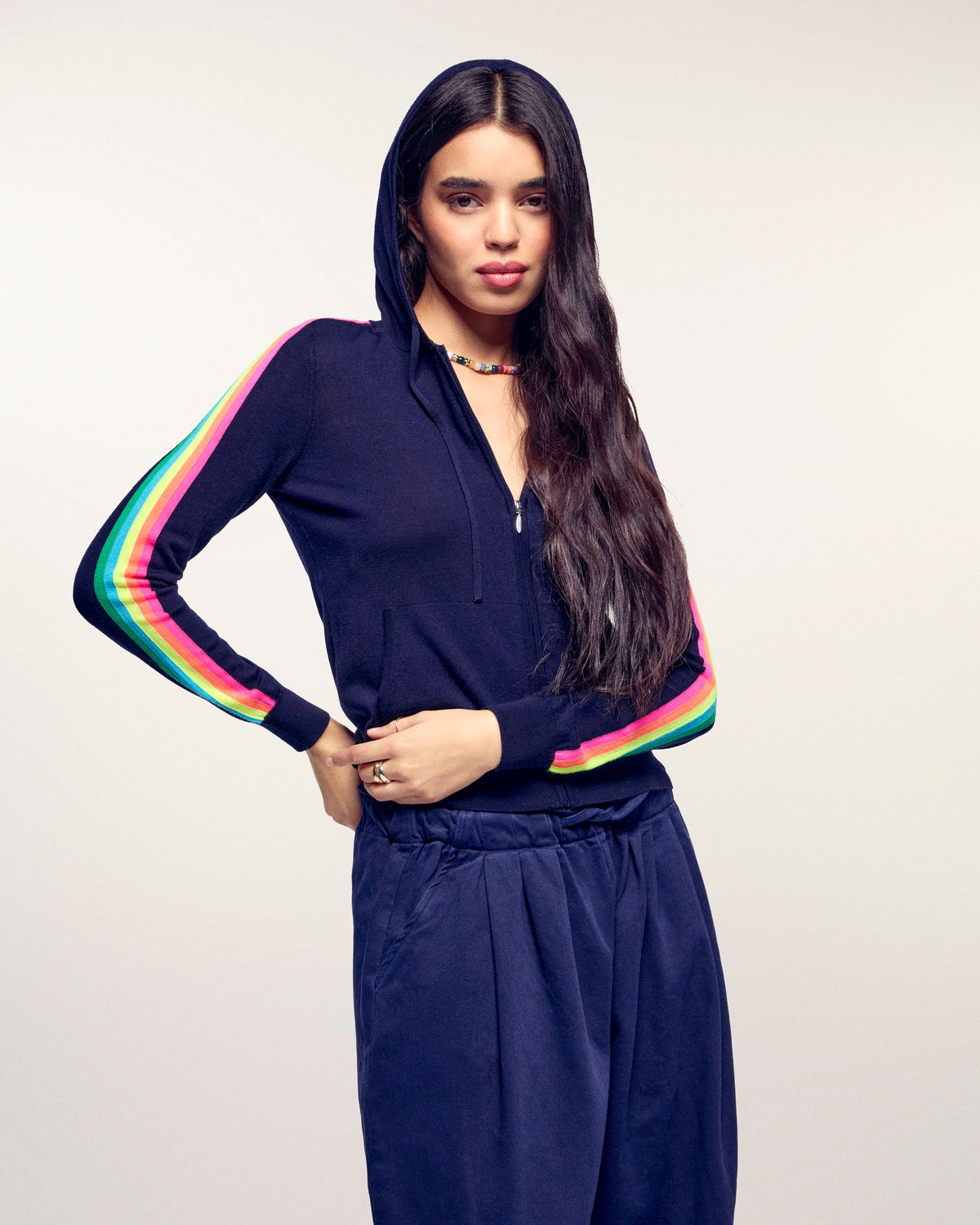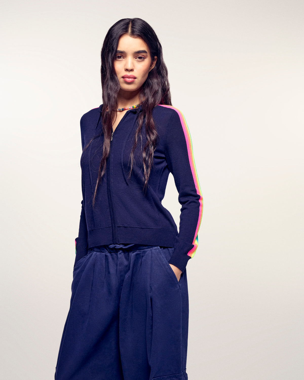 This cropped hoodie sweater reveals multicolored stripes along the sleeves, adding a signature From Future touch. Crafted from 2-ply merino wool, it features a drawstring hood, zip closure, and ribbed edges. Complete your look with casual jeans or straight-leg pants.