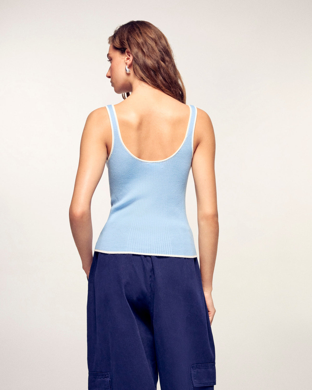 An essential of the summer wardrobe, this extra-fine merino wool tank top focuses on an elegant interplay of contrasts. Its fitted cut is enhanced by two-tone finishes at the neckline and armholes, offering a modern and graphic silhouette ideal for the mid-season.